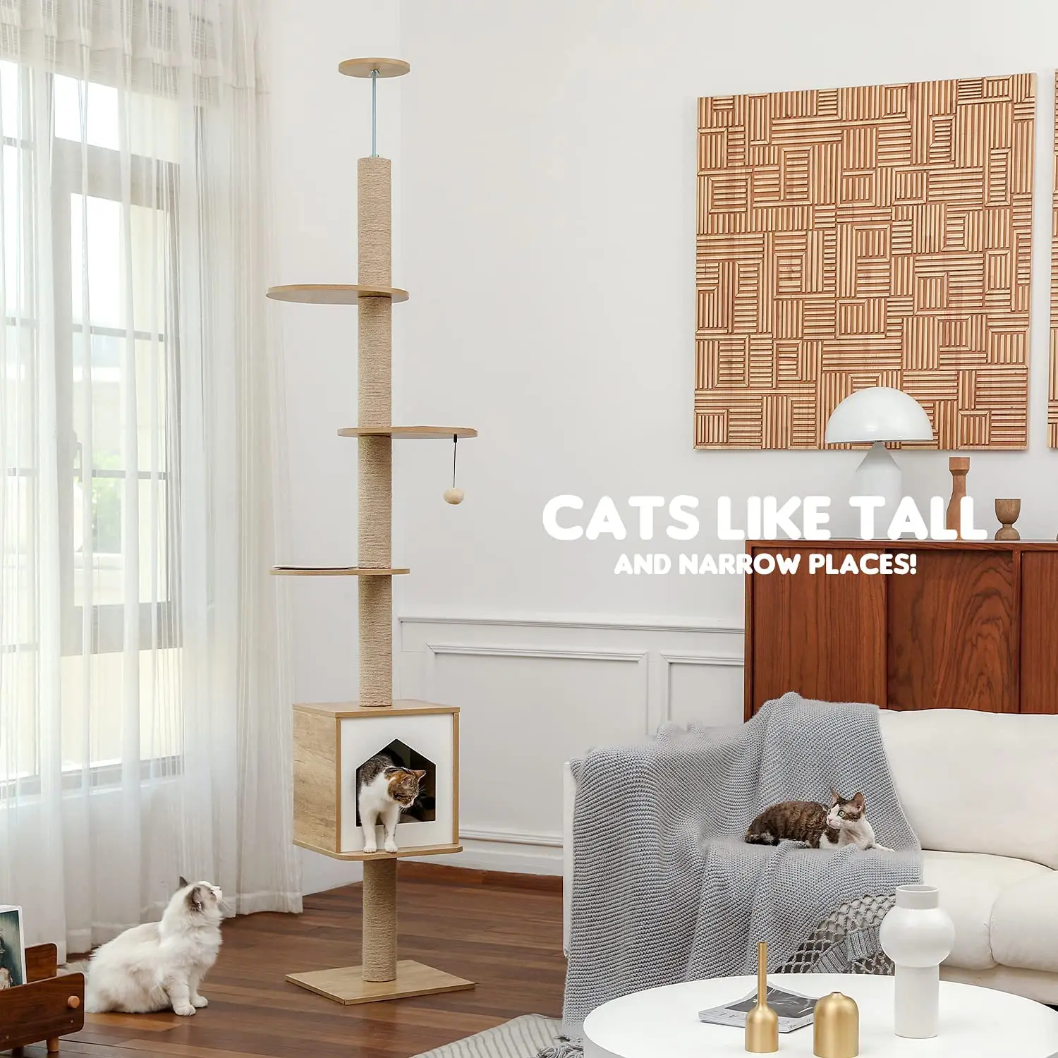 ·Стабильный и прочный: для обеспечения безопасности ваших пушистых друзей, это прочное и надежное кошачье дерево изготовлено с использованием высококачественной натуральная сизалевая веревка и древесная доска из МДФ. Тип от пола до потолка обеспечивает максимальную стабильность при прыжках, царапинах, упражнениях, а также предотвращает тряску игрушки так сильно, что она сползает.