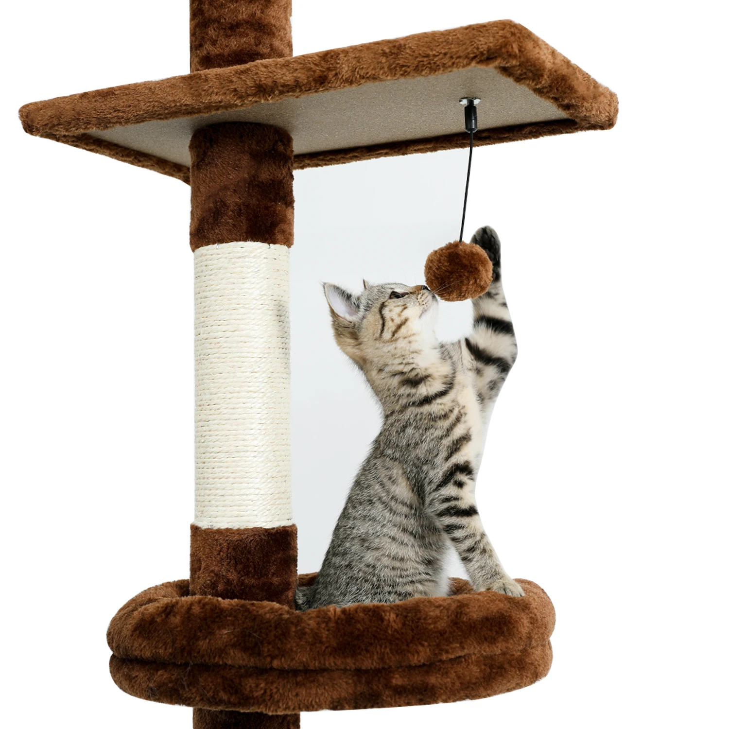 AMT0098·Центр активности для скалолазания кошек: это напольное и потолочное кошачье дерево напоминает настоящее дерево с регулируемой высотой, чтобы удовлетворить различные потребности котят в высоте скалолазания. Кошечка с 5 плюшевыми платформами, 1 уютная круглая кровать для кошек и 3 Когтеточка с сизалем, свисающий шар для кошек, чтобы поймать, поймать, поймать