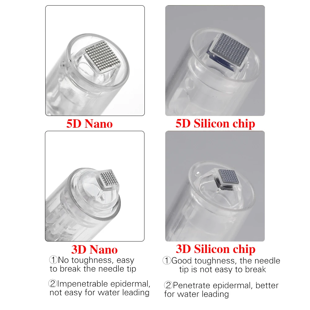 Материал Nanochip-кристаллический кремний высокой чистоты, поверхность наночипа длиной 49 микрон (1 мм = 1000 микрон) Расположение наконечника, сломанный эпидермис способствует абсорбции, способствует регенерации клеток, длина области 3D наночипа составляет 3 мм, Длина площади 5D наночипа-5 мм, наночипы используют контакты наномасштаба, может быть, очень тонкие, 80 нанометров, короткая, как 0,1 мм, просто откройте возбуждение кожи, не будет касаться с учетом особенностей кожи. Это не только решает проблему поглощения кожи, но и делает ее Безболезненной и неинвазивной.