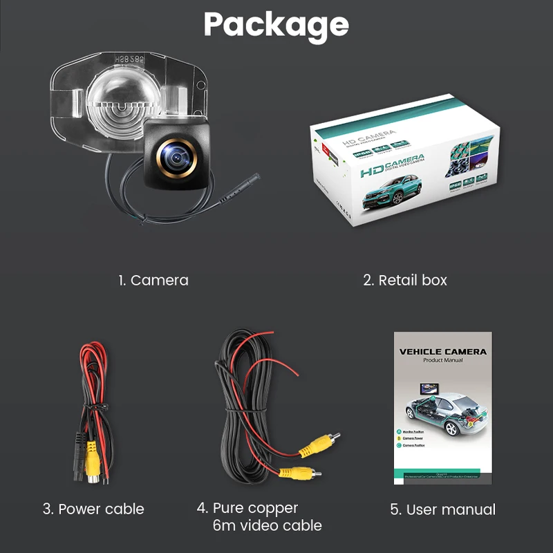 1. Камера заднего вида2. Розничная коробка3. Кабель питания4. Чистый медный 6 м видео кабель5. Руководство пользователя