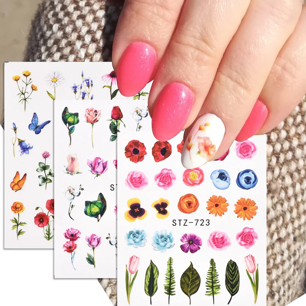 Весенние акварельные наклейки для ногтей, наклейки с цветами, листь...