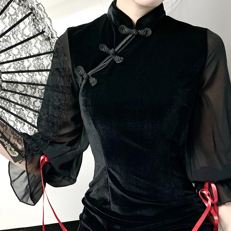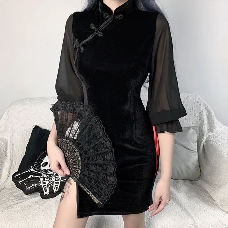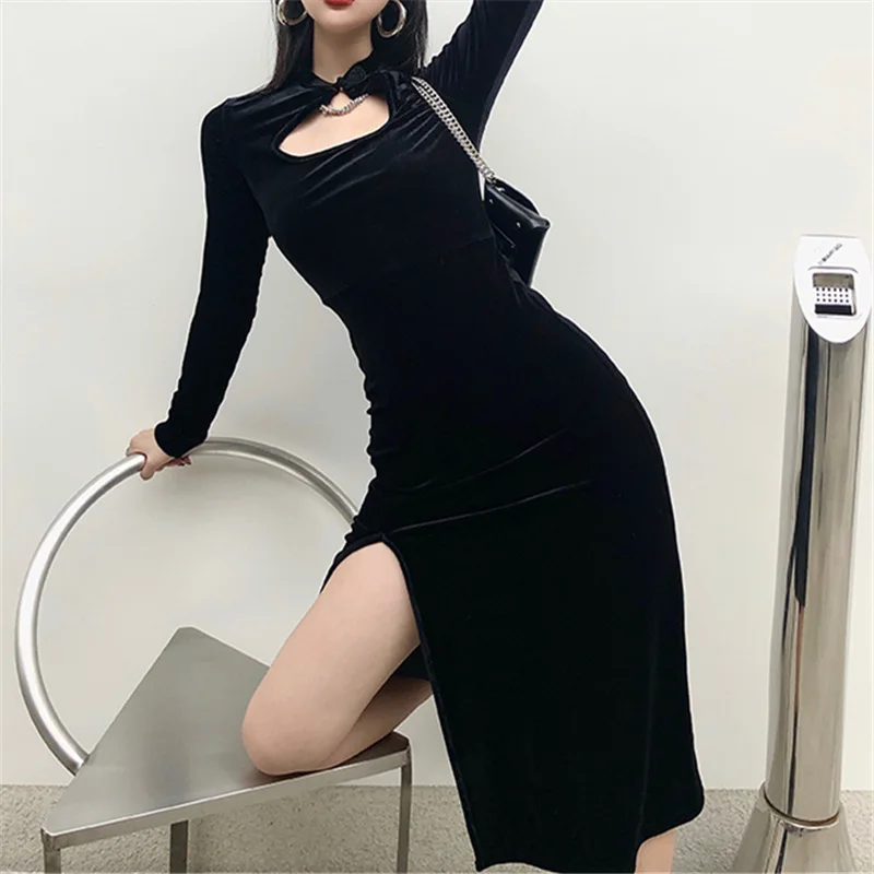 Винтажное черное китайское бархатное платье-Ципао QWEEK, весна 2021...