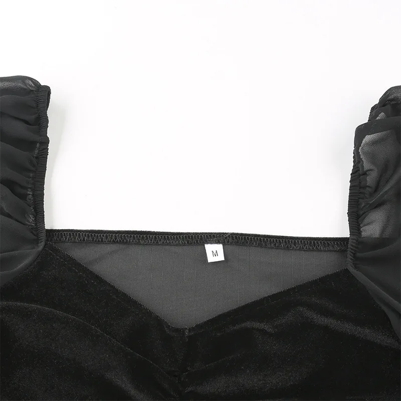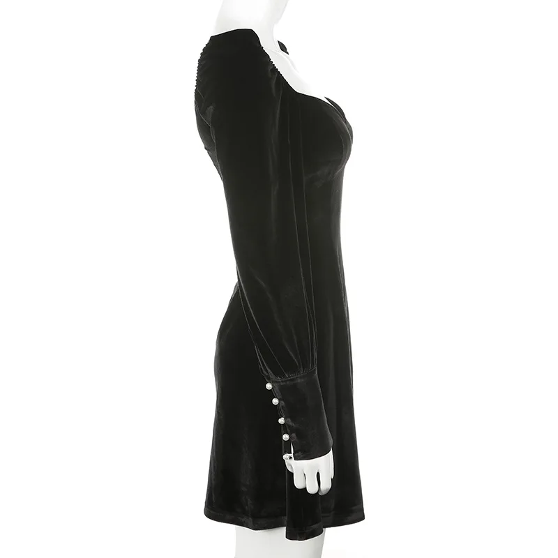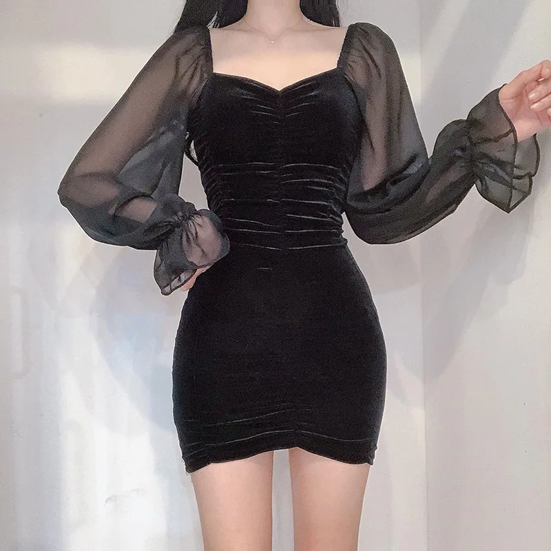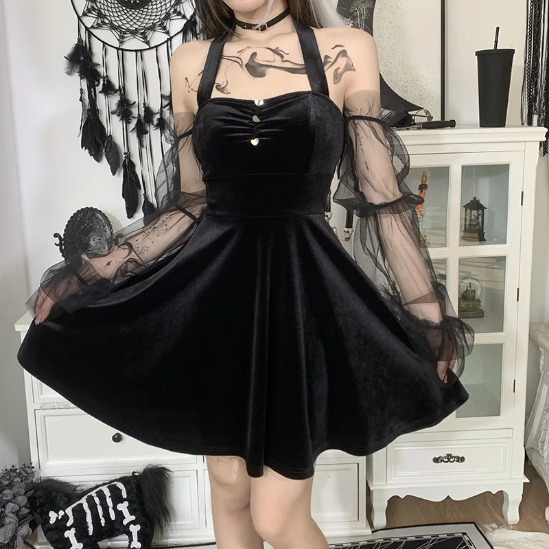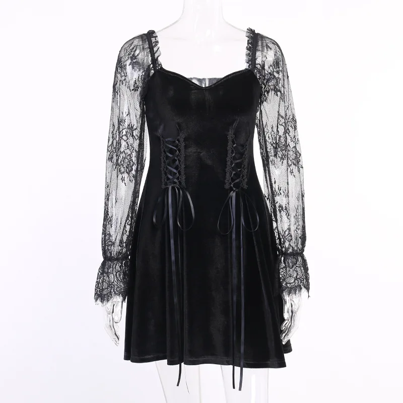 Женское бархатное мини-платье, винтажное сексуальное платье с кружевными рукавами-фонариками, темно-черное платье в готическом стиле, осень 2021