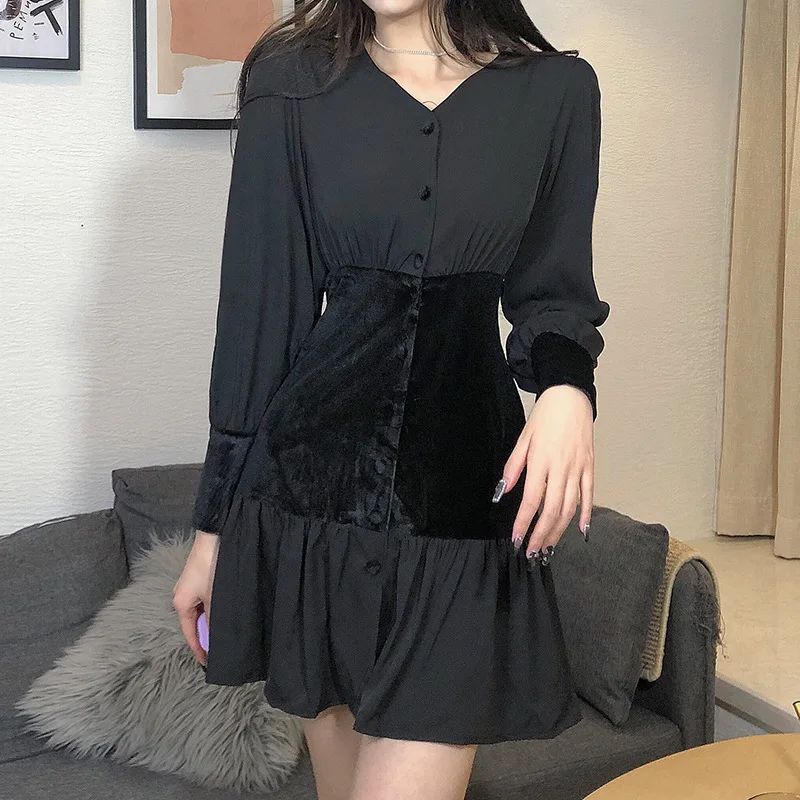 Женское бархатное платье с высокой талией, черное платье лоскутного...
