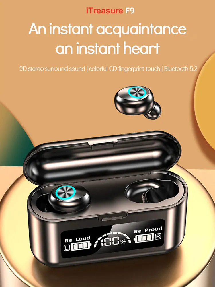 TWS-стереонаушники F9 с поддержкой Bluetooth 5,2 и зарядным футляром на 2000 мА ч