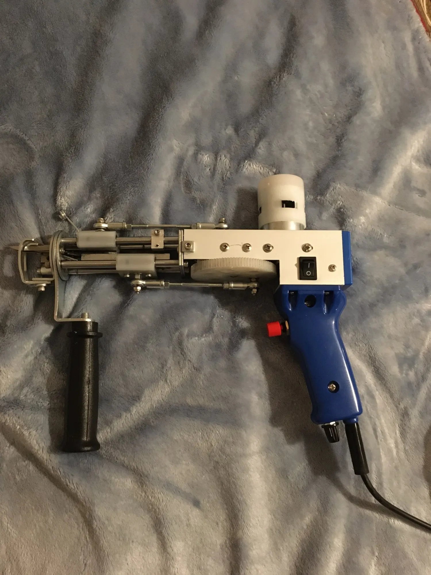 Электрический пистолет для ковров, подходит для высокоскоростного плетения и гибкого движения. Мы можем использовать ружье (обычно используется для изготовления ковриков) для изготовления украшений, которые можно повесить на стену. Этот процесс включает в себя пробежку отдельных нитей через листы ткани для формирования форм и узоров. Иногда также изготавливают коврики и другие украшения для показа дома.