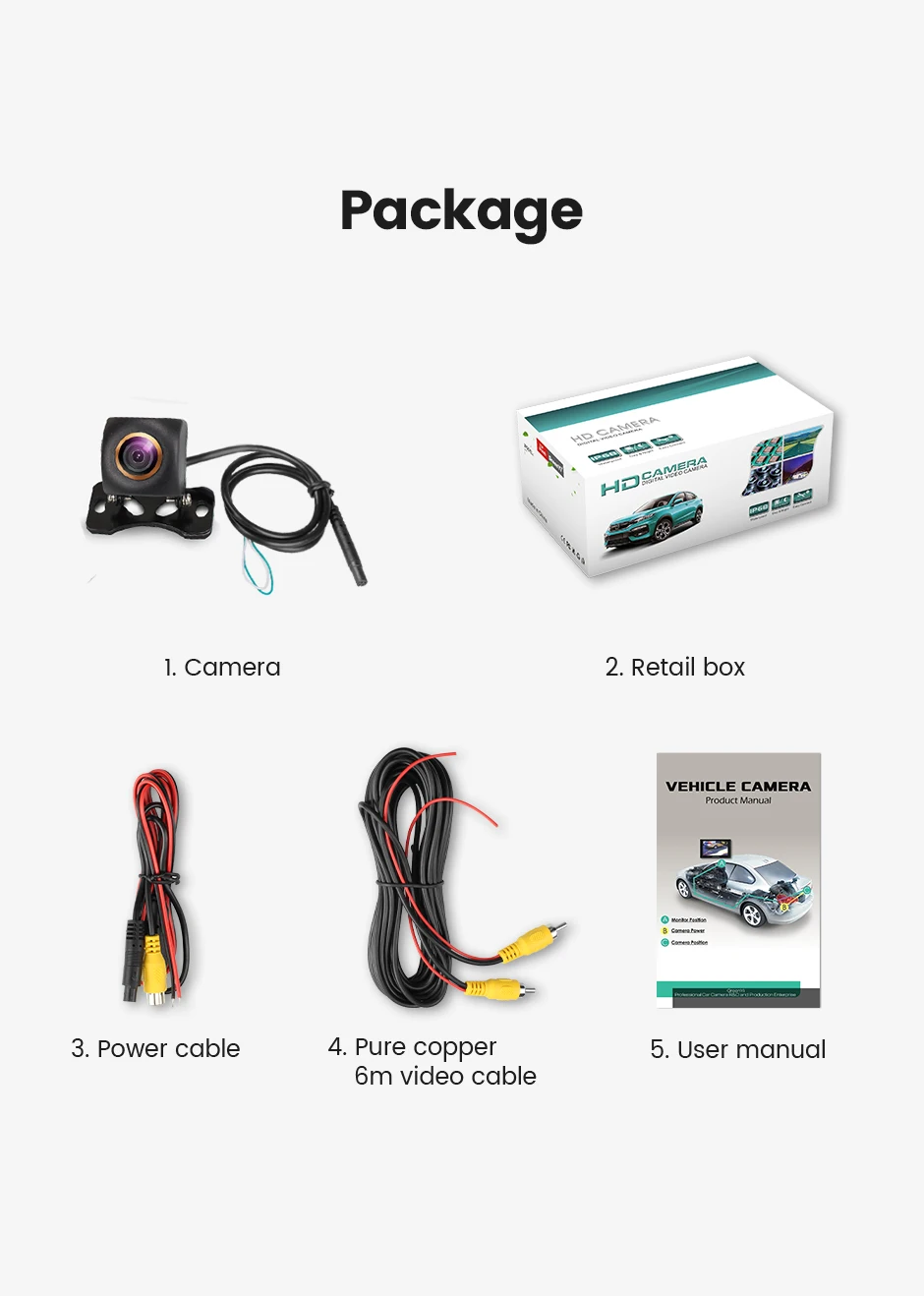 1. Камера заднего вида2. Розничная коробка3. Кабель питания4. Чистый медный 6 м видео кабель5. Руководство пользователя