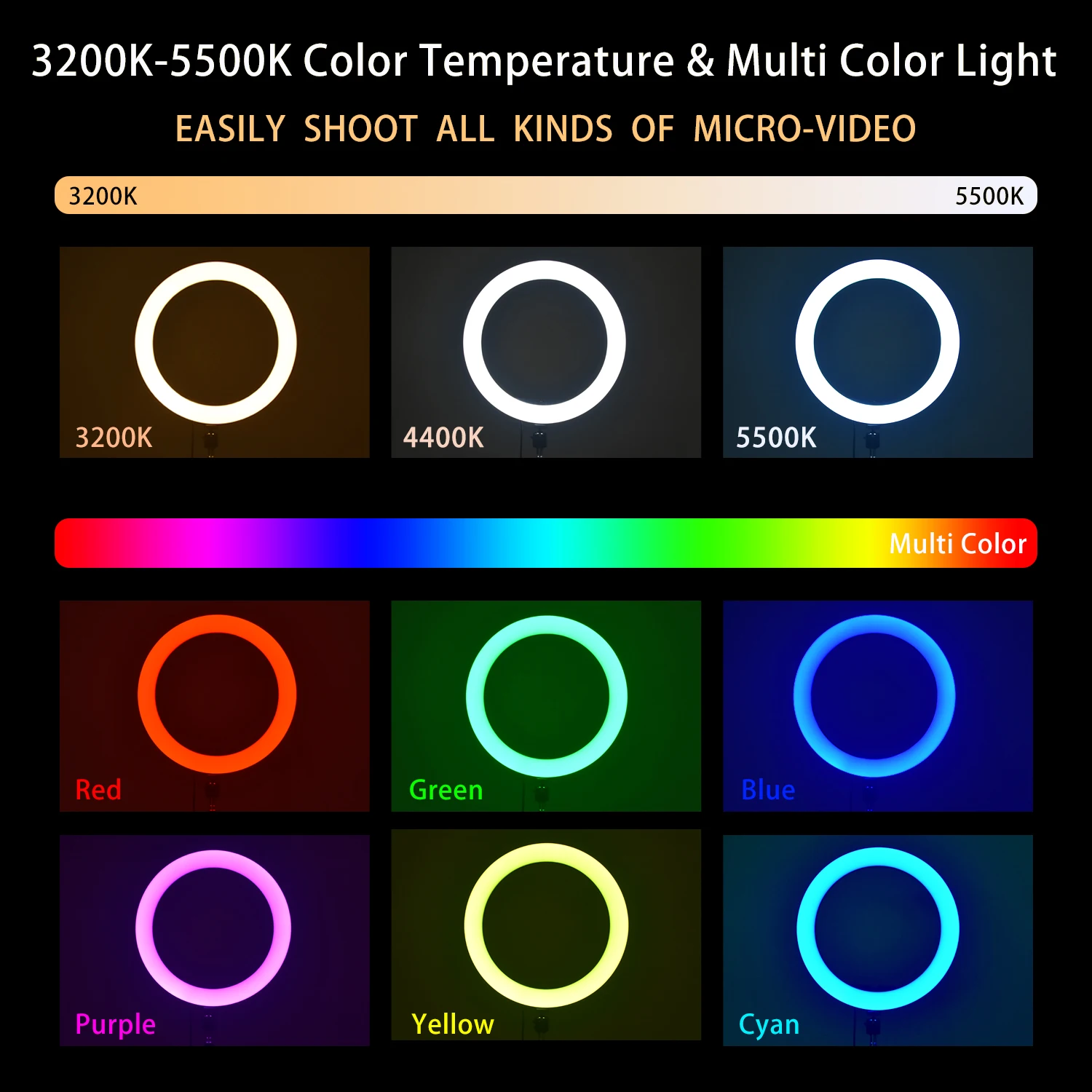 1. 【Различный и затемнения RGB кольцо Light】Features 10 уровней яркости и различные цветовые режимы (3 нормальное освещение-желтый теплый белый, теплый белый, белый + 15 RGB Освещение + 9 флеш-карта rainbow освещение с 3 скорости). Приглушите/Осветите уровни яркости и выберите идеальное освещение для создания потрясающих фотографий/видогов.2. 【Ультра стабильный и выдвижной трипод】изготовлен из высококачественного алюминия, эта Складная подставка для штатива может быть расширена с мин высоты 16 ”до макс 54”. Просто Вытяните и закрепите его на желаемой высоте для отличного использования как на рабочих столах, так и на полу! Ноги штатива были специально разработаны для того, чтобы быть очень крепкими, чтобы стоять на столе или полу.3.【 Мути-функциональный Usage】Our 2-в-1 дизайн сочетает в себе профессионального светового кольца с штатив-Трипод стойка и умные часы-телефон крепления для того, чтобы сделать идеальный инструмент для создания прямых трансляций, видеозаписи и фотосессии. Отличный свет для Twitch потокового, TikTok, YouTube видео, Vlogs, макияж красоты, фотографии, онлайн обучения, социальных сетей и т. Д.4.【Adjustable Регулировка вращения Head】Set этот 10-дюймовая цветная (RGB) кольцо свет под любым углом, регулируя его 360 ° вращения головки. 2 крепления для телефонов совместимы с большинством смартфонов, с чехлами или без них и могут быть прикреплены к центру кольцевого света или закреплены на тройном полюсе в портретном, ландшафтном, или любой идеальный угол, который вы хотите.5. 【Питание от USB и беспроводной контроллер 】 6.6ft usb-кабель работает с большинством usb-портов на ПК, ноутбуках, банках питания, usb-адаптере/розетках на 5 В/2 А. До 60-футового диапазона, затвор камеры совместим с телефонами iOS и Android. Проводной/беспроводной пульт дистанционного управления позволяет менять настройки цвета, яркости, вспышки и скорости (только беспроводной), как вам нравится.Часто покупали вместе
