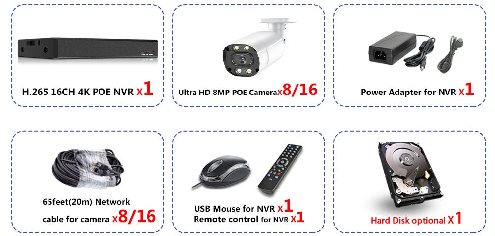 1 сетевой видеорегистратор H.265 16CH 4K & 8MP POE NVR;8/16 X H.265 HD POE аудио 8.0MP IP Крытый Открытый ИК День ночного видения атмосферостойкие камеры;8/16X65 футов (20 м) сетевой кабель для камеры;1 x Блок питания для NVR;1 х USB мышь для NVR;1 компакт-диск программного обеспечения для NVR;1 пульт дистанционного управления для NVR;Жесткий диск опционально!