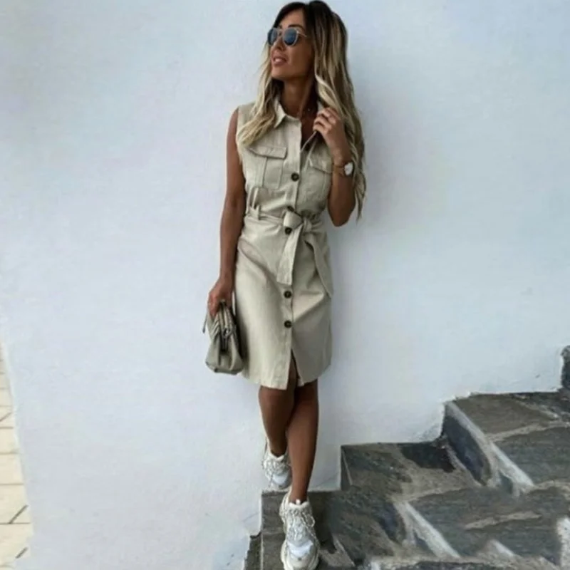 Летнее хлопковое Пляжное Платье До Колена с поясом и карманами