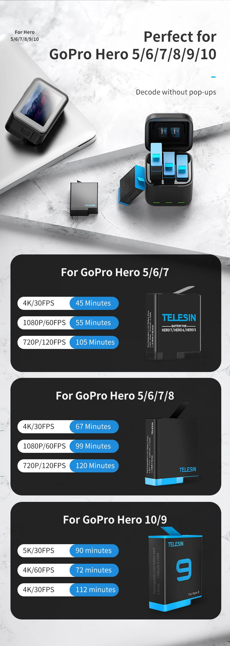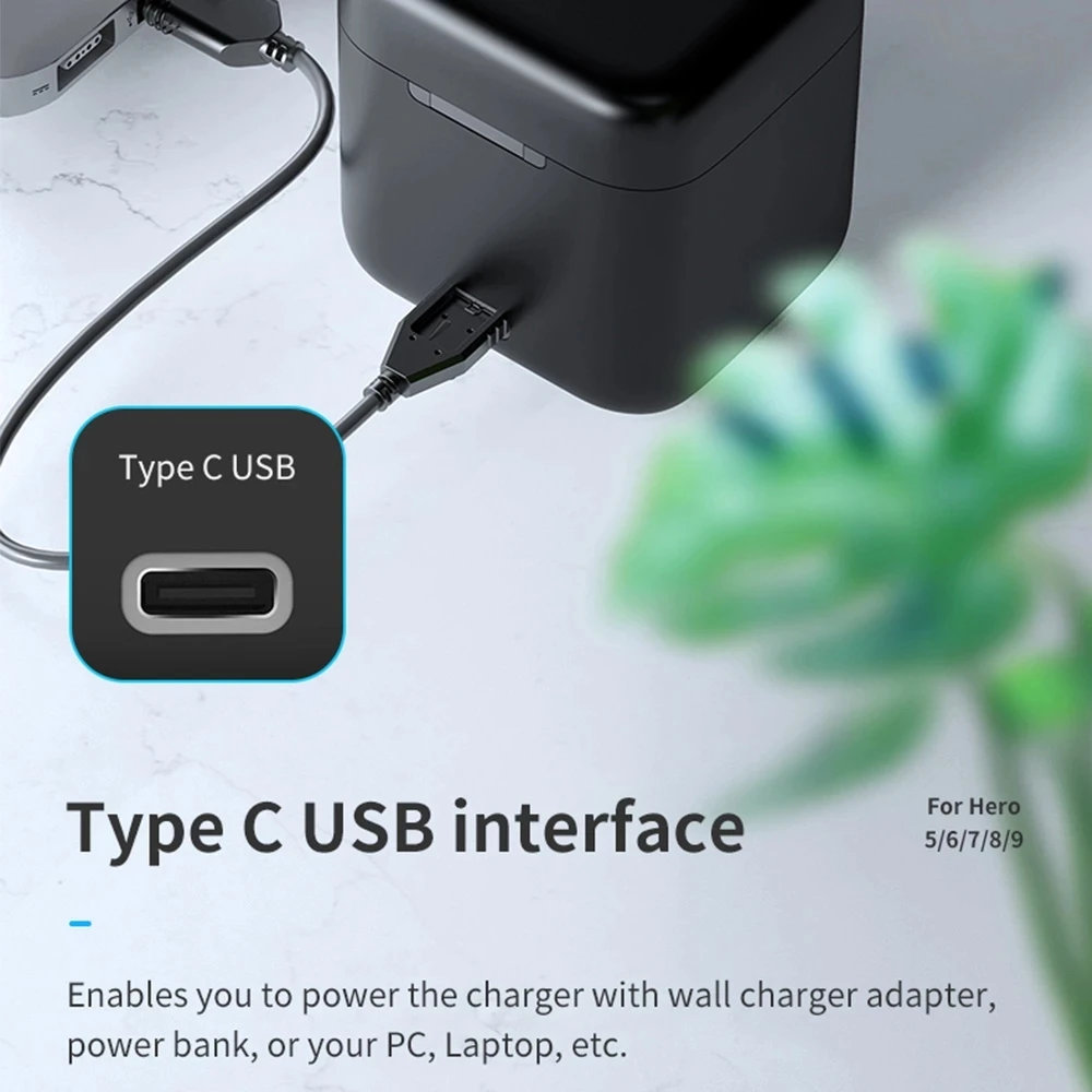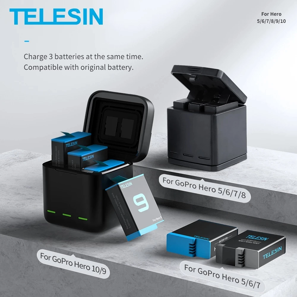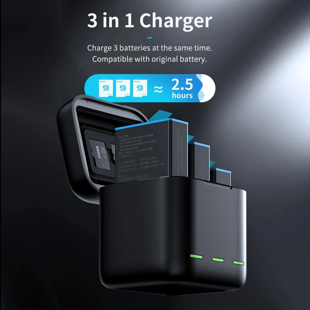 Зарядное устройство TELESIN для GoPro Hero 10, 9, 8, 7, 6, 5, 3 режима, со светодиодсветильник кой, TF-карта, черный