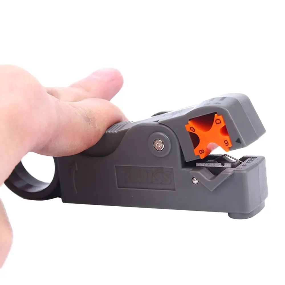Особенности:* Материал: Изготовлен из высококачественного АБС-пластика, который отличается износостойкостью, долговечностью.* Регулируемые лезвия: регулируемый зачистки лезвия для различной толщины изоляции, предотвращая повреждение экранирования и проводников.* Портативный: легкий, компактный, простой в эксплуатации.* Высококачественная пружина: делает зачистки быстро, экономя рабочую силу и повышая эффективность работы.* Острые лезвия: острые лезвия обеспечивают более точную резку.