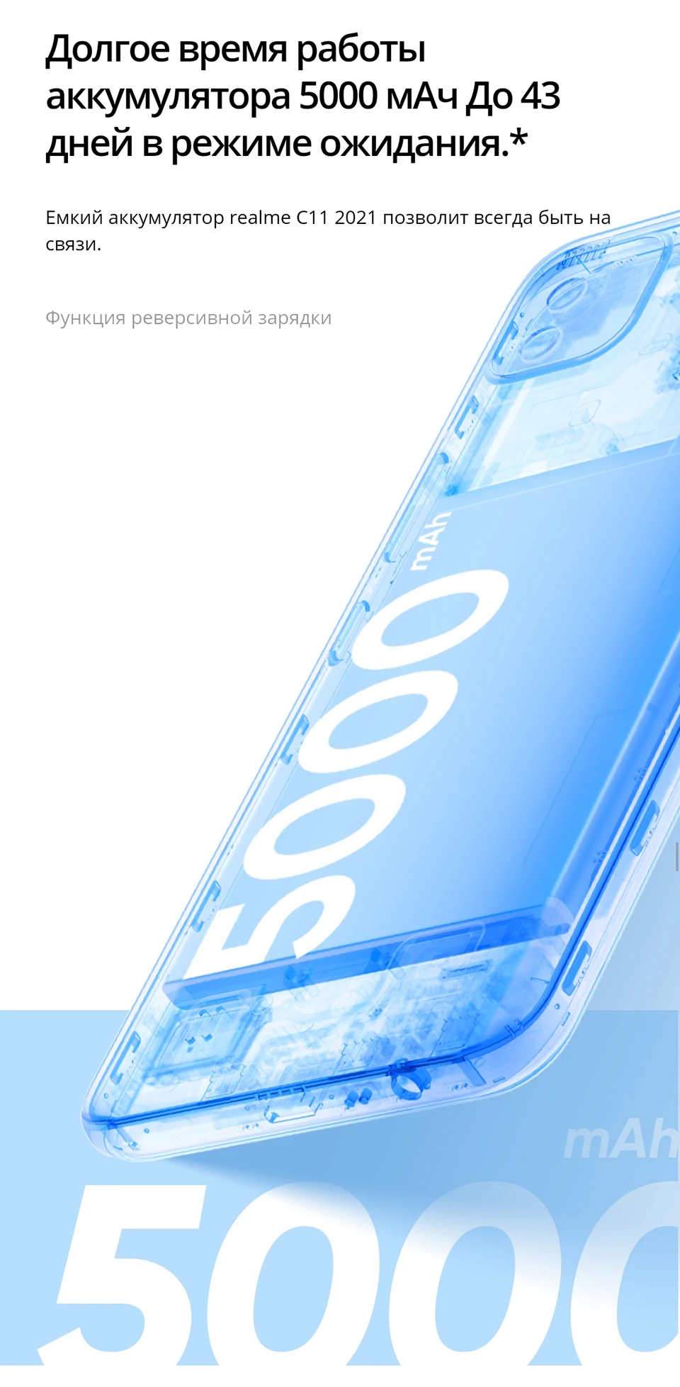 На работе или на ходу, realme C11 2021 отвечает вашим ежедневным потребностям с его длительным аккумулятором (Поддерживает обратную зарядку)
