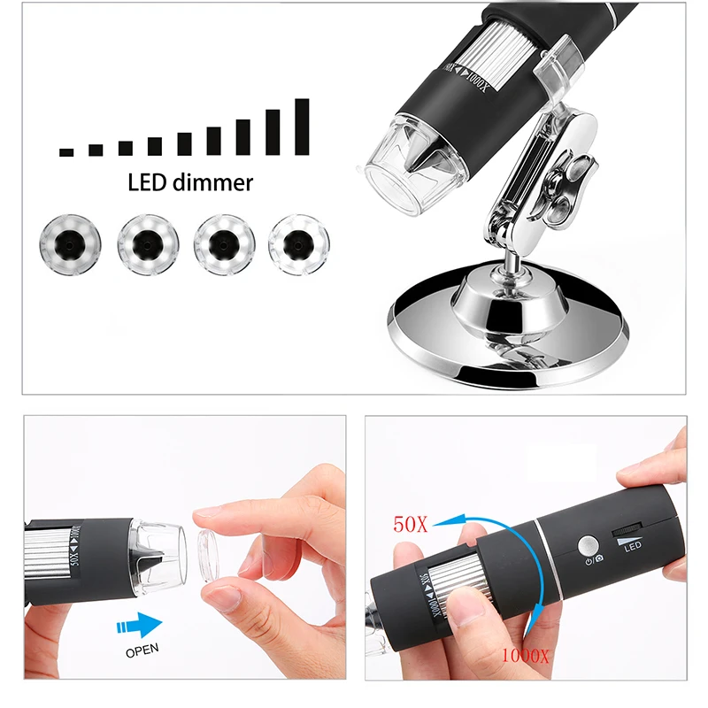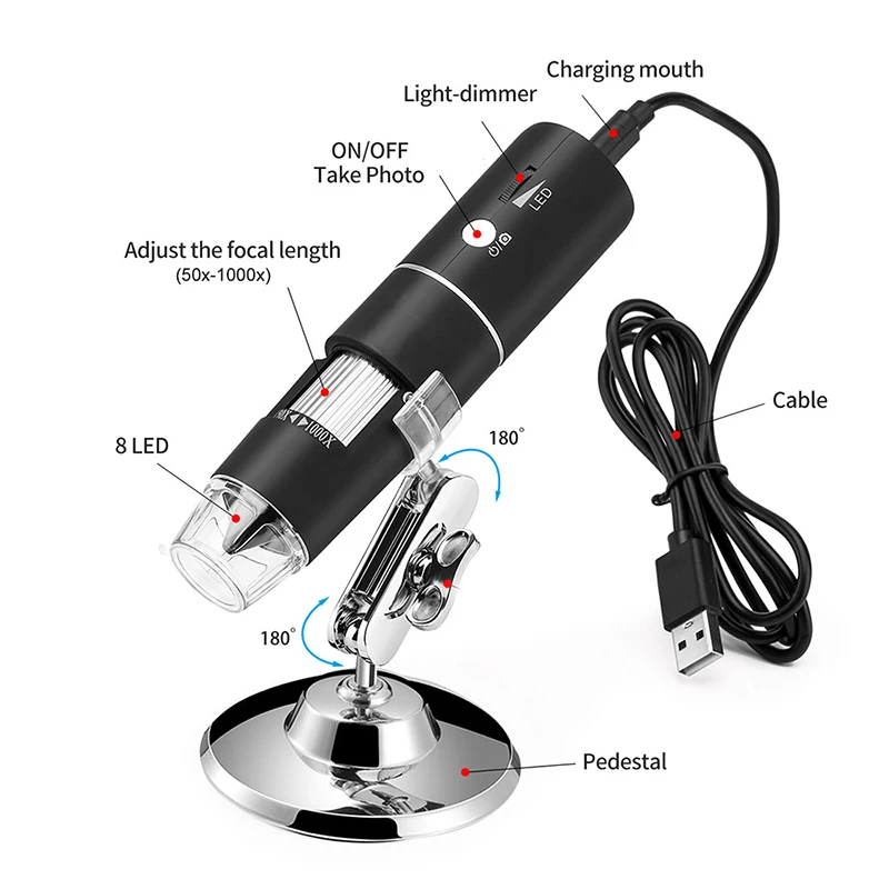 1. Зум 50X-1000X и высокое разрешение: Зум 50X-1000X и технология обработки датчика CMOS на 2 миллиона пикселей подарят вам четкий микромир и прекрасный опыт при наблюдении, съемке изображений или записи видео. Расстояние изображения должно быть 3-60 мм, чтобы получить самый четкий обзор. Его можно использовать для просмотра, драгоценных камней, мелких насекомых или клещей. А также используется для проверка печатных материалов, текстиля, ювелирных изделий, печатных плат и многого другого.