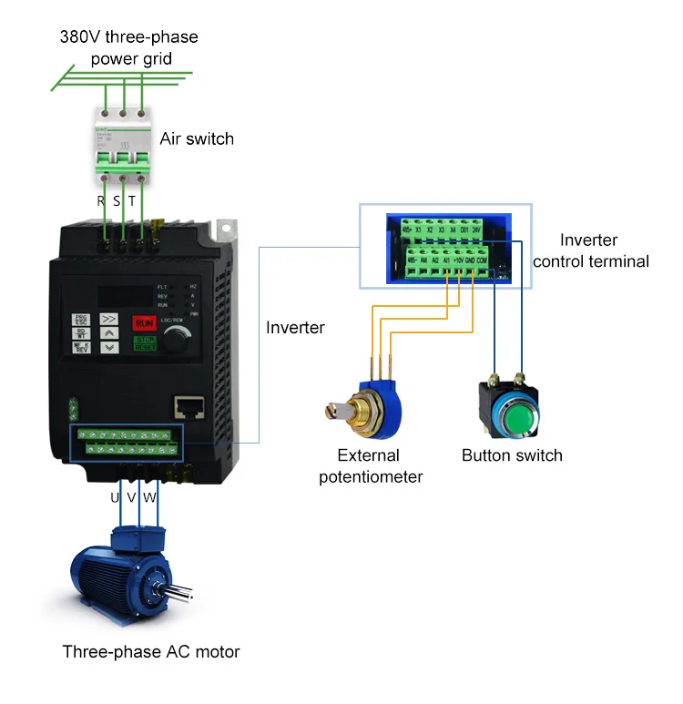U, V, W-это выходные клеммы преобразователя частоты и подключенный трехфазный асинхронный двигатель.
