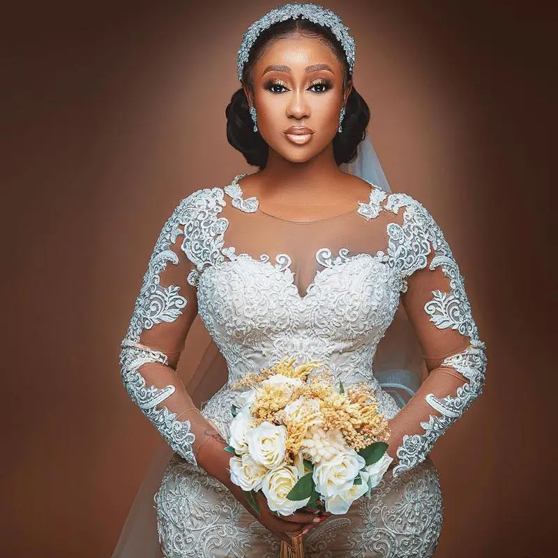 Свадебное платье с жемчугом, с длинными рукавами и прозрачным вырезом, без вуали, размера плюс