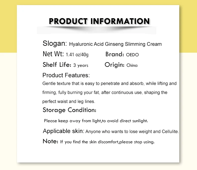 Экстракт женьшеня идеально сочетается с гиалуроновой кислотой, содержит множество смягчающих веществ, мягкую текстуру, которая легко проникает и поглощает, при подъеме и подтягивании, полностью сжигая жир, после непрерывного использования, подчеркивает идеальную талию и линии ног.
