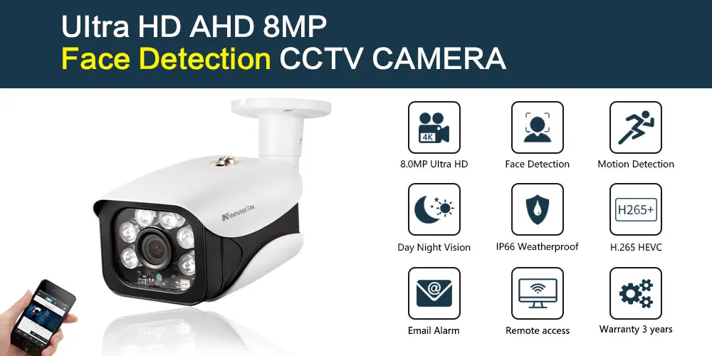 1, Ультра HD 4K дисплей высокой четкости;2. Ультра HD 8MP AHD камера, металлический материал, IP66 водонепроницаемый, подходит для внутреннего и наружного использования; Пыленепроницаемый, надежный для домашней безопасности;3. Улучшенное H.265 Сжатие видео, подключи и работай, простота установки;4. Поддержка распознавания лица, записи лица, воспроизведения лица, обеспечивает ультра высокое разрешение видео наблюдения, обеспечивая максимальную детализацию и четкость доступны;5. Поддержка ночного видения Ultra HD, расстояние передачи составляет 500 метров;6. Поддержка IR-CUT переключателя двойного фильтра, днем и ночью для достижения мониторинга, цвет не является частичным искажением цвета;7. Поддержка обнаружения движения, оповещения по электронной почте, воспроизведения видео;8. Поддержка Android,Iphone,Ipad, ПК, P2P просмотра;9, удаленный доступ в любом месте, в любое время;