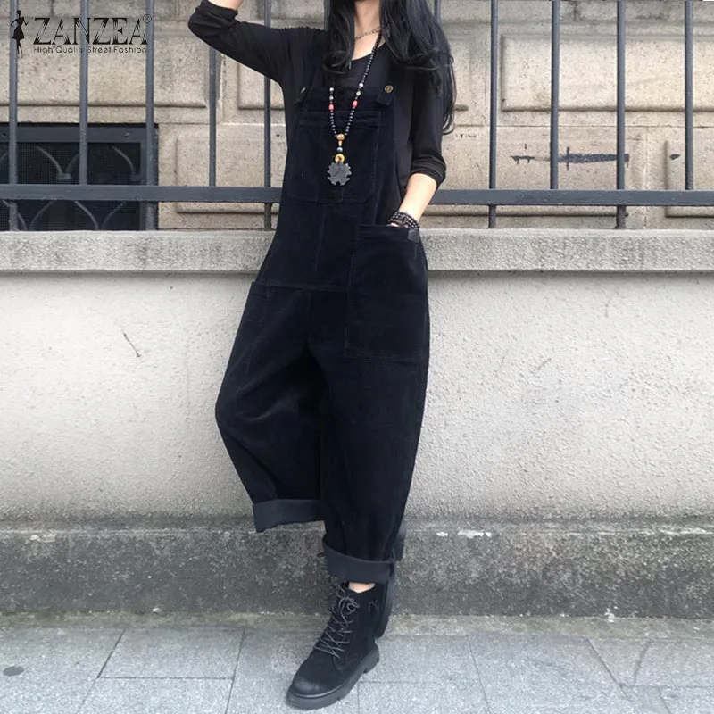 Винтажный вельветовый комбинезон, женские осенние комбинезоны ZANZEA, повседневные брюки-султанки на подтяжках, Женские однотонные комбинезоны, Женский оверсайз