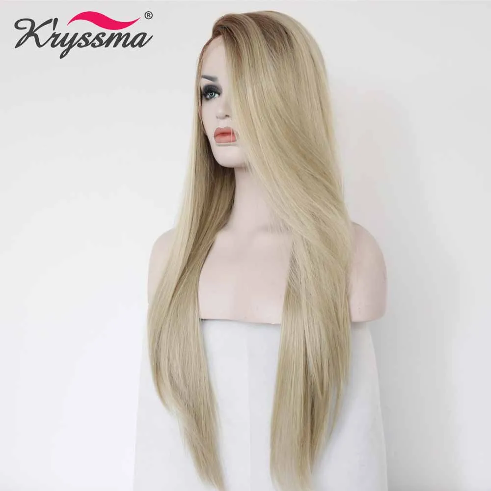 Kryssma Long Straight Wig Ombre Blonde Lace Front Wig with Brown Woots Heat Resistant Fiber Cosplay Synthetic Wigs for Women