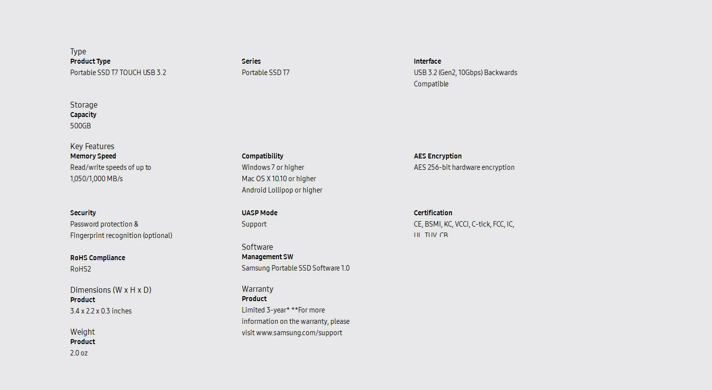 Внешний SSD-накопитель Samsung T7, 500 Гб, USB Type C 2 ТБ, сенсорный