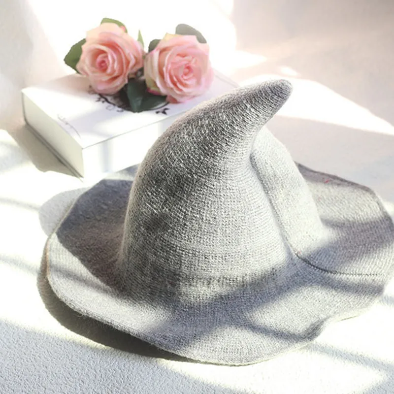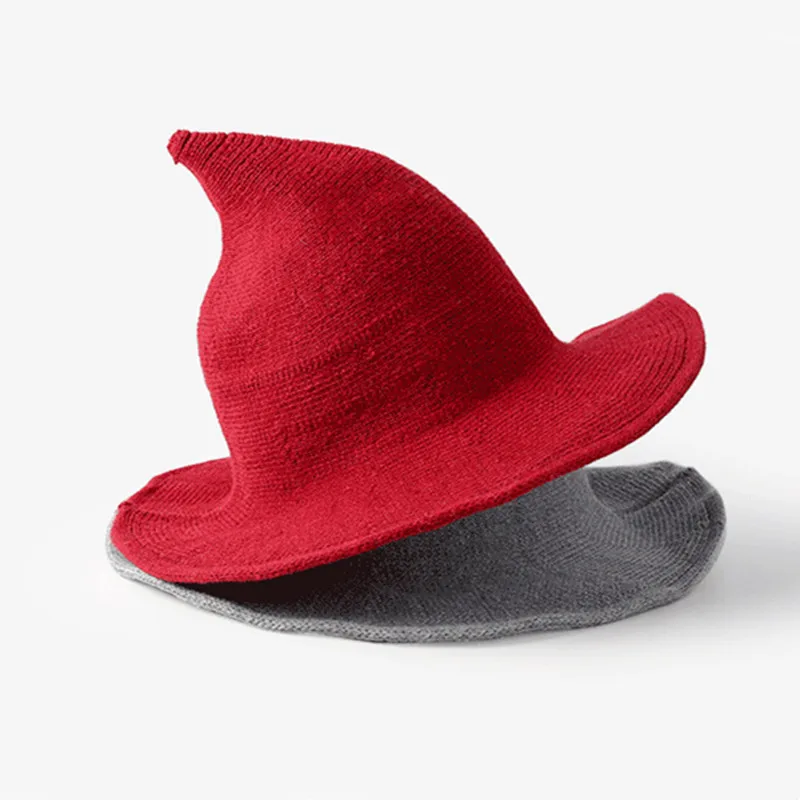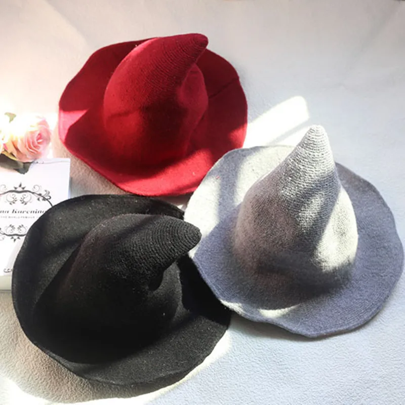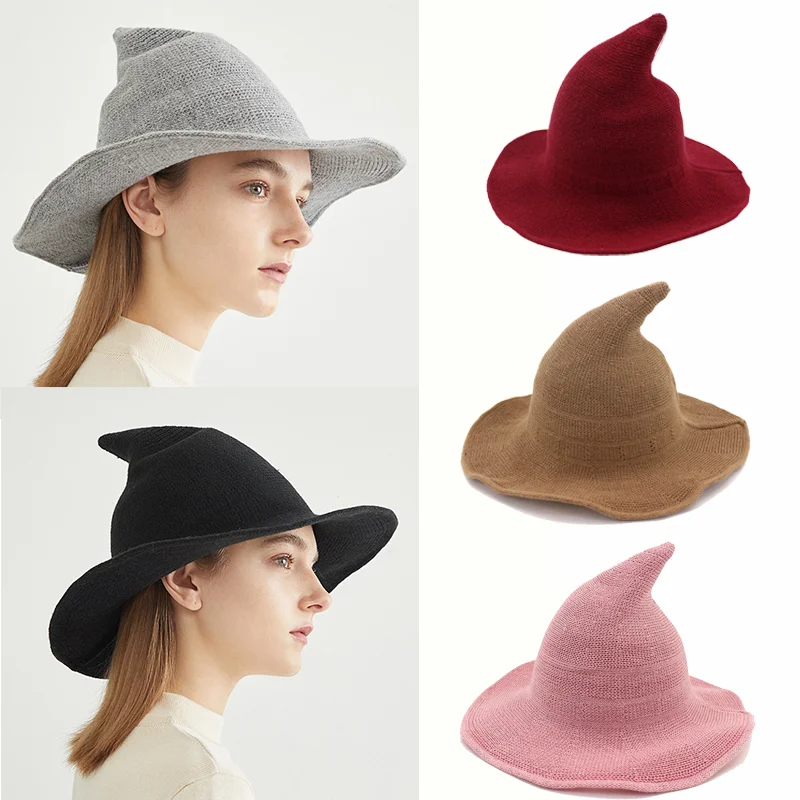 Новинка, элегантная вязаная шапка ведьмы на Хэллоуин для мужчин и женщин, осенне-зимние Панамы, шерстяные вязаные шапки, складные однотонные Остроконечные шапки, подарки
