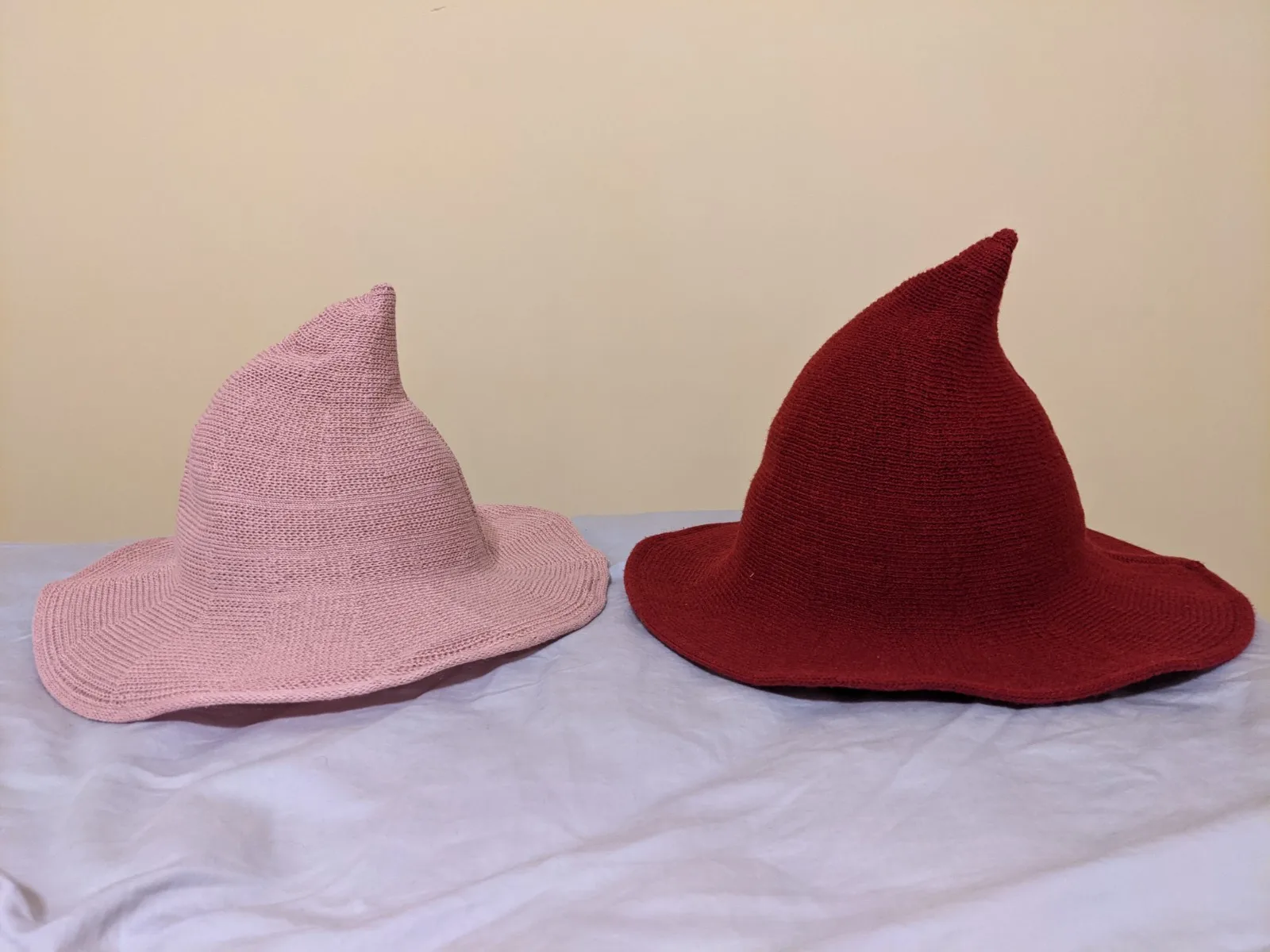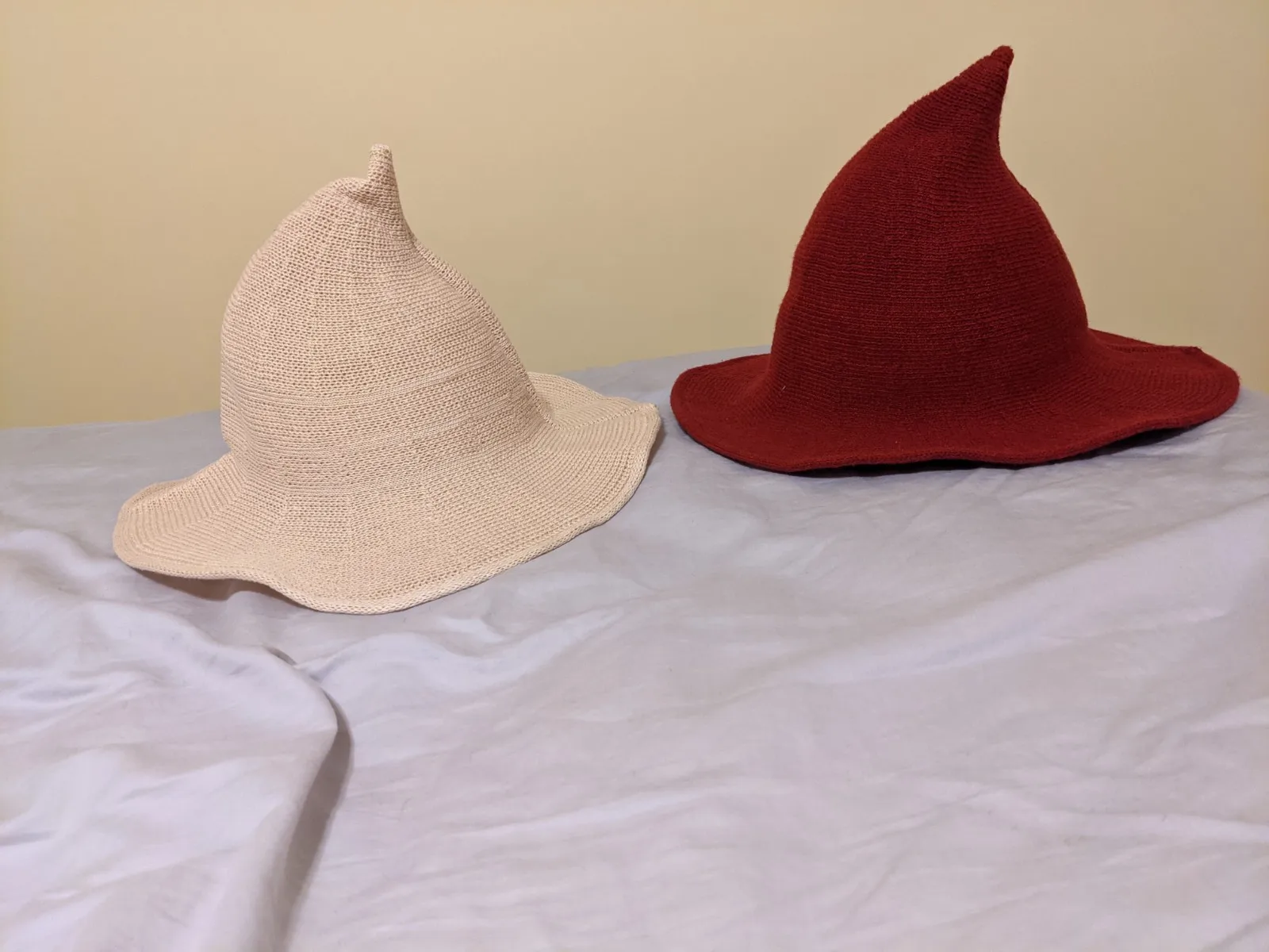Бежевая версия довольно тонкая, колючая, очень жесткая и свободная, поэтому частично просвечивает. Я приложил фотографию бежевой шляпы слева по сравнению с красной шляпой, которую я купил у другого продавца. Немного не в форме на кончике, но я надену его, чтобы вернуть его в положение.