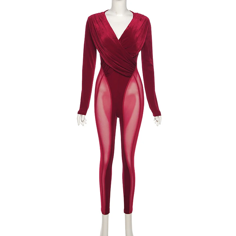 Женский бархатный комбинезон в стиле пэчворк с сеткой и глубоким V-...