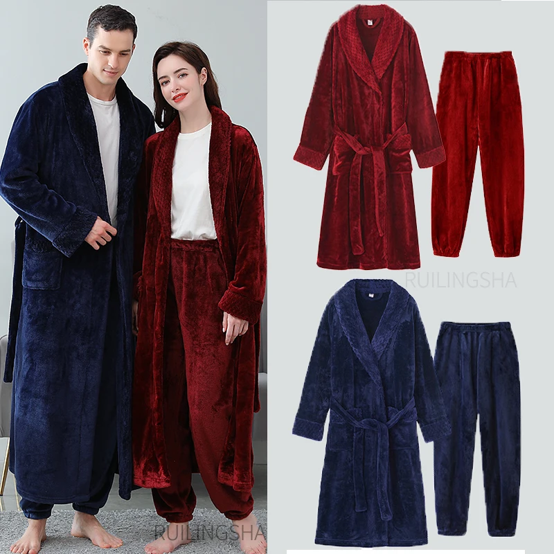Мужской зимний очень длинный теплый фланелевый Халат, брюки, комплекты, халаты из кораллового флиса, банный халат с длинным рукавом, пижама, женская одежда для сна