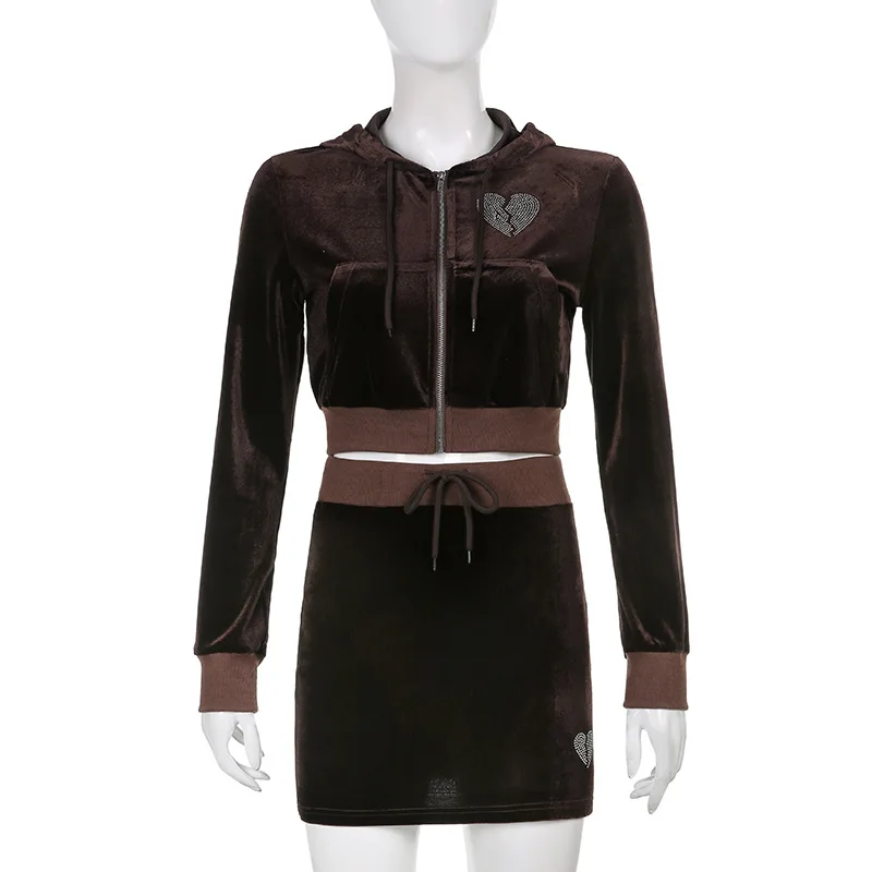 Женский комплект из двух предметов ArtSu, укороченная юбка и топ, уличная одежда из коричневого бархата, укороченный топ с длинным рукавом, мини-юбка, розовый спортивный костюм, Y2K
