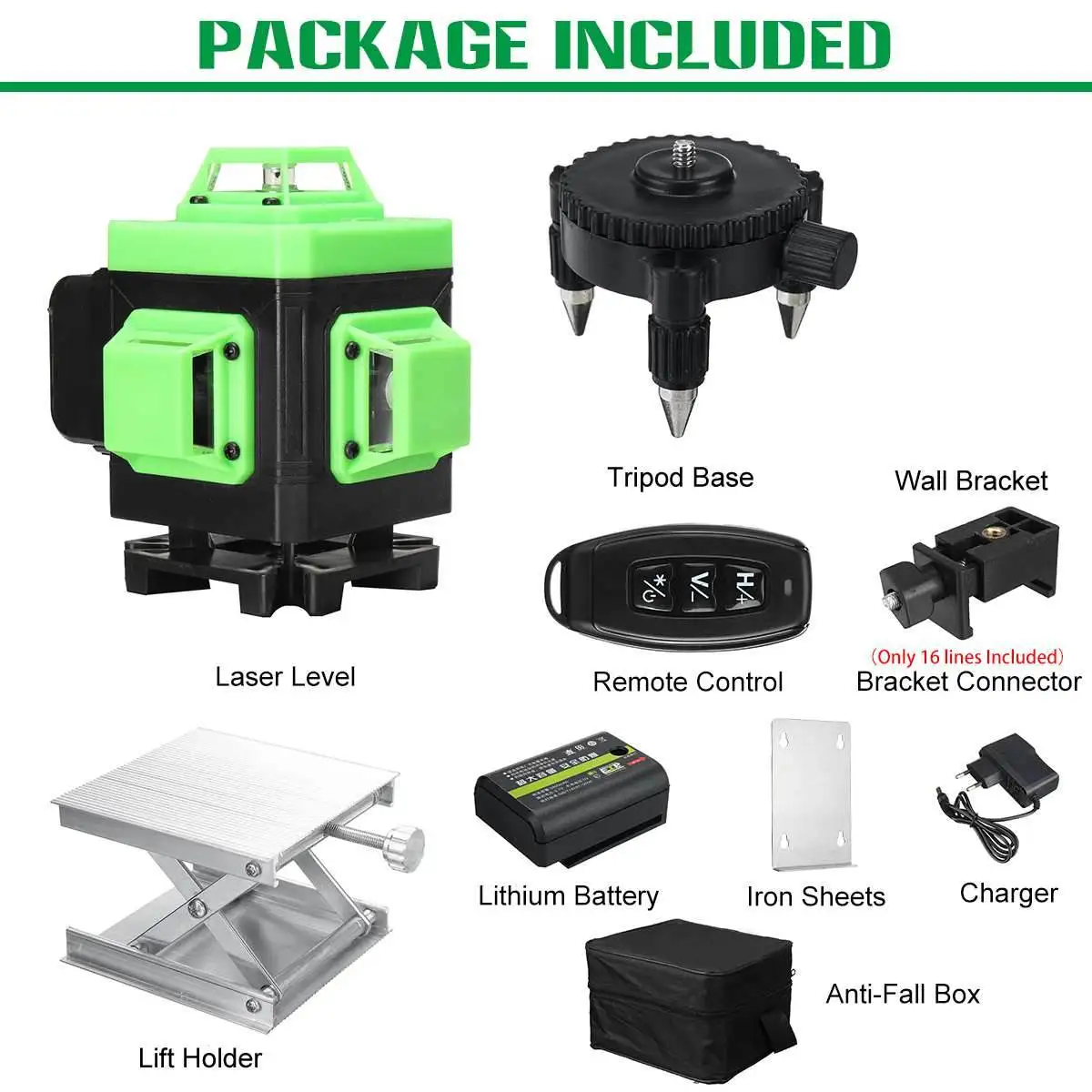 Посылка включена (16 линий):1 x лазерный уровень1 пульт дистанционного управления1 x подъемный держатель1 х настенный кронштейн1 х железные листы1 х кронштейн соединитель1 х литиевая батареяЗарядное устройство (штепсельная Вилка европейского стандарта)-1 шт.1 x коробка против падения1 х основание штатива1 x Руководство пользователя Посылка включена (8/12 линий):1 x лазерный уровень1 пульт дистанционного управления1 x подъемный держатель1 х настенный кронштейн1 х железные листы1 х литиевая батареяЗарядное устройство (штепсельная Вилка европейского стандарта)-1 шт.1 x коробка против падения1 х основание штатива1 x Руководство пользователя Характеристики:Материал: инженерный пластик шасси из алюминиевого сплаваЛазерные линии: 16/12/8 линийЦвет лазера: зеленыйРасстояние крепления стены: 7 ммГоризонтальная/Вертикальная Точность: ± 1 мм/7 мДиапазон автоматического выравнивания: ± 3 °Степень вращения: 360 °Рабочее расстояние: 25 мФункция слэш: ДаУровень защиты: IP54 пылезащитный и водонепроницаемыйРабочая температура: -20 ℃ ~ 50 ℃Емкость аккумулятора: 6000 мАчРабочая среда: внутри/снаружиМощность: 1 кисть для маскирующих средств 6000 мА/ч, Перезаряжаемые Li ion аккумулятор Батарея/Прямая зарядка с помощью разъема (4,2 V)Размеры: 11*11*11,5 см/4,33*4,33 * 4.53inПрименение: вспомогательная плитка для фиксации, украшения стен, напольная плитка для фиксации, Лестничные Поручни, пушистый потолок, напольная плитка, штукатурка. Особенности:1. 4D 16/12/8 линии облучения, 360 ° без мертвого угла.2. Крытый и открытый универсальный, высокая яркость зеленый, крытый и открытый четко, Дальняя проекция расстояния, высокая Лазерная высота, четкие линии.3. Дизайн сенсорного экрана, управление сенсорным экраном, более удобное. Точное измерение и более удобное в использовании.4. 8/12/16 линий может быть необязательным, подходит для различных случаев для удовлетворения различных инженерных потребностей.5. Crashworthy и анти-стук, crashworthy и анти-стук.6. Международный стандарт IP54 Водонепроницаемый и пыленепроницаемый, многократная защита, длительный срок службы в суровых условиях.7. Аккумулятор большой емкости 6000 мА · ч с более длительным сроком службы, долгим сроком службы, временем работы более 72 часов.8. ± 3 ° автоматическая функция самовыравнивания. Звуковое предупреждение при превышении диапазона автоматического выравнивания. Примечание:1. Замеры сделаны вручную, поэтому возможны 0,5-1 см из-за различий в связи с тем, что измерения выполнены вручную.2. В связи с использованием разных по светильник экране монитора фактический цвет товар точно такой же, как и цвет изделия на фото может быть s светильник ly отличается из-за характеристик монитора компьютера.