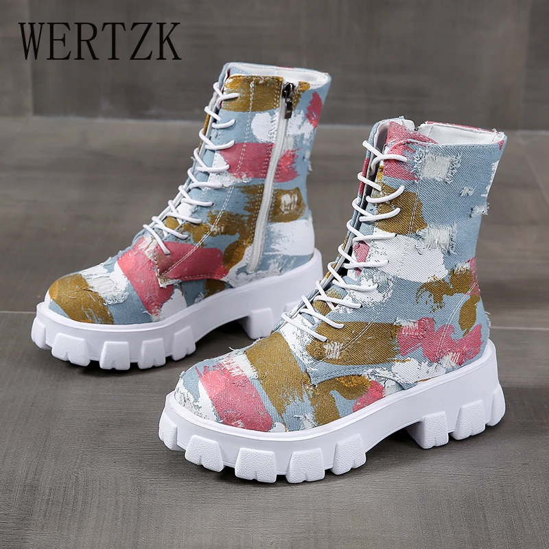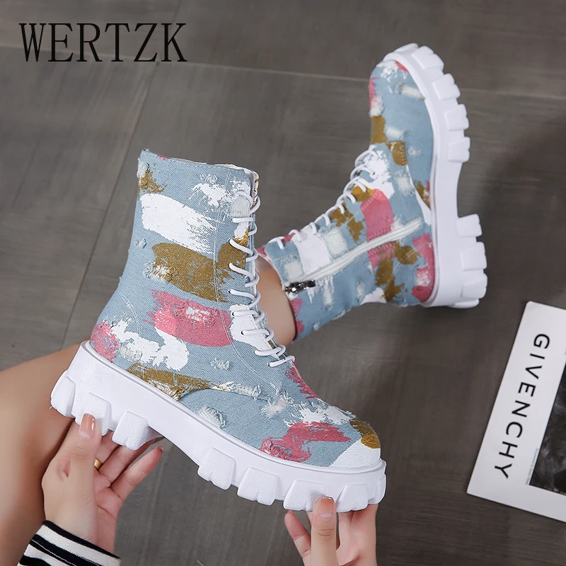Женские джинсовые ботильоны, повседневные ботинки в стиле панк на платформе и массивном каблуке, с круглым носком, на шнуровке, большие размеры до 40, 2021