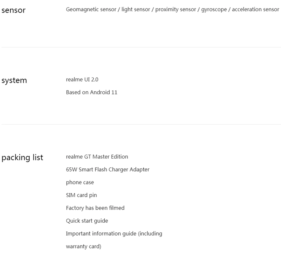 Основные характеристикиRealme GT Master Edition CN версия с оригинальным зарядным устройством для СШАCPU ----------Snapdragon 778G 5GВосьмиядерный процессорЭкран --------6,43 "Super AMOLED2400x1080 FHD +Частота обновления 120 Гц, частота касания 360 ГцОЗУ + ПЗУ-8 ГБ + 128 ГБ/8 ГБ + 256 ГБКамера ------ 64MP + 8MP + 2MP AI Тройная камера, фронтальная камера 32MPАккумулятор ------4300 мАч(Typ), поддерживаетСупер зарядка 65 ВтОС ----------- пользовательский интерфейс realme, поддержкаМногоязычный и Google PlayДругие ------- Bluetooth 5,2, GPS, OTG,Nfc