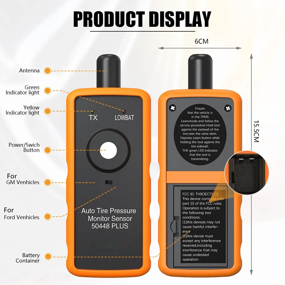 Для транспортных средств GM, оснащенных системой контроля давления в шинах (TPM) 315 или 433 МГц, после вращения шин необходимо выполнить процедуру повторного обучения сенсору, пульт дистанционного управления Модуль приемника замка двери Замена или замена датчика давления в шинах. Эта процедура повторного обучения может быть выполнена с помощью специального инструмента EL-50448.Also работает на 2014 GM моделях