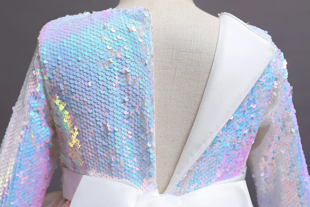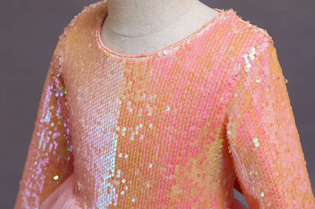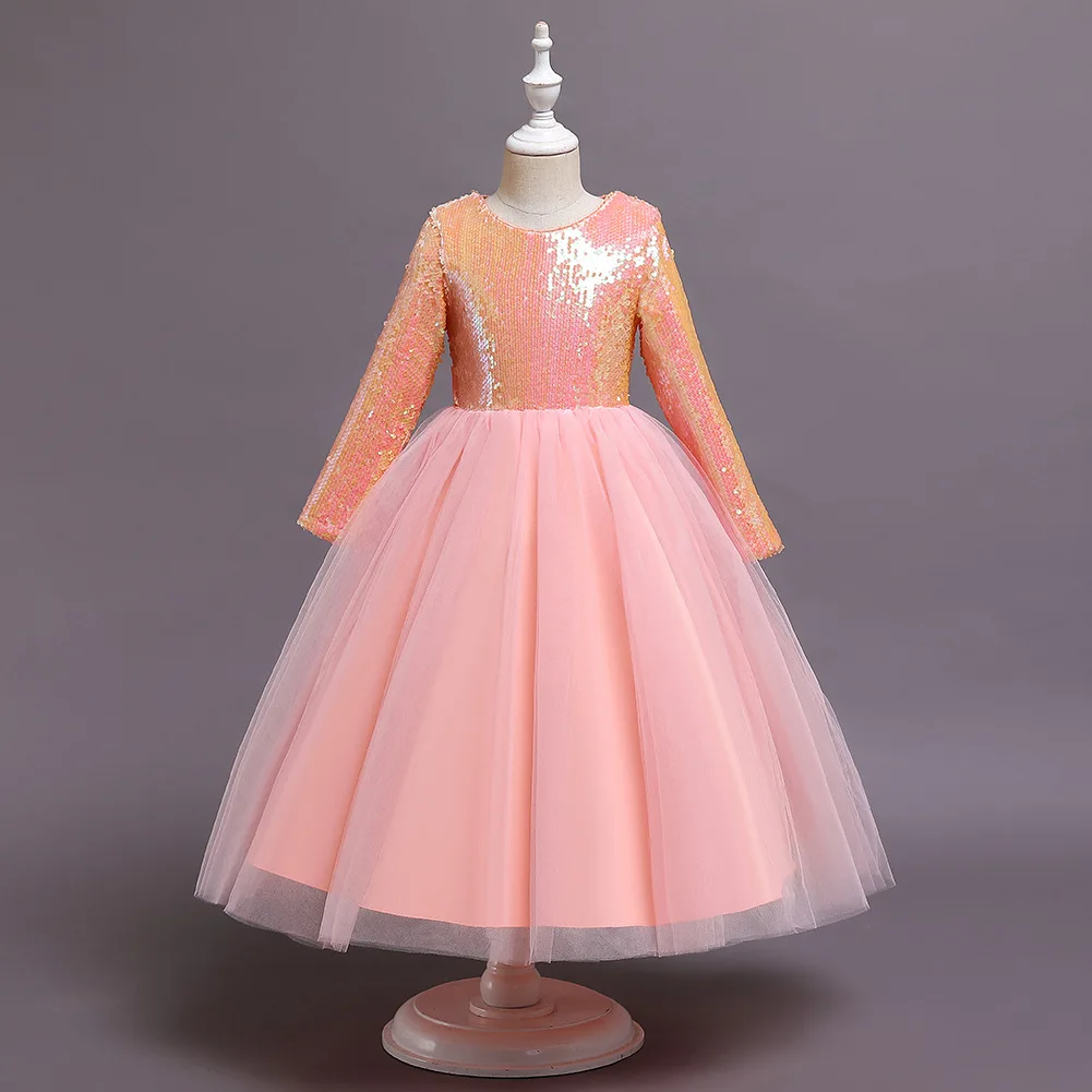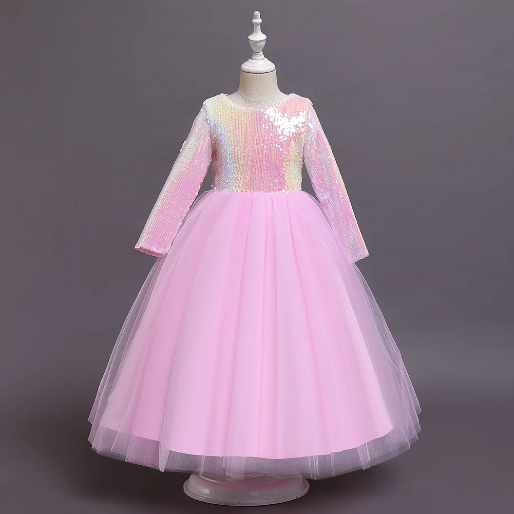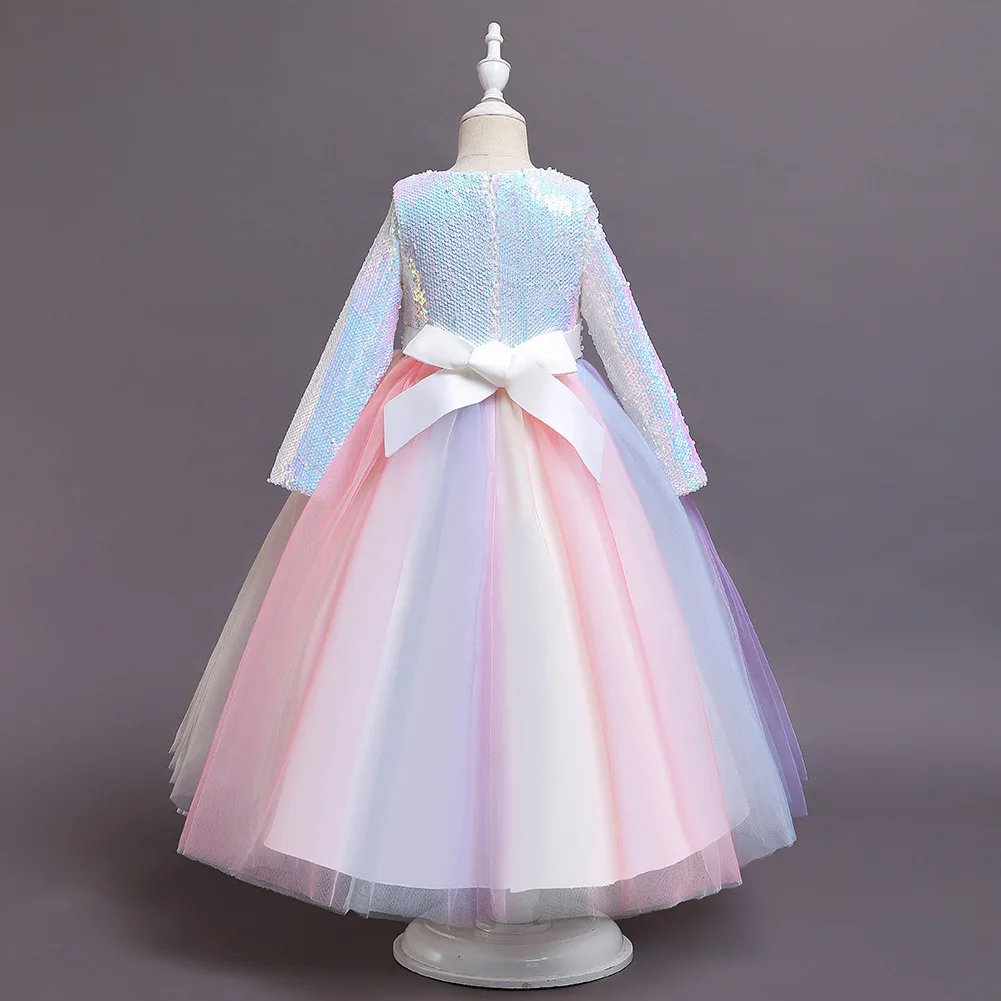 Детское длинное платье для девочек от 4 до 14 лет, расшитое пайетками и радужной сеткой Длинное Элегантное Пышное Платье принцессы из тюля на свадьбу