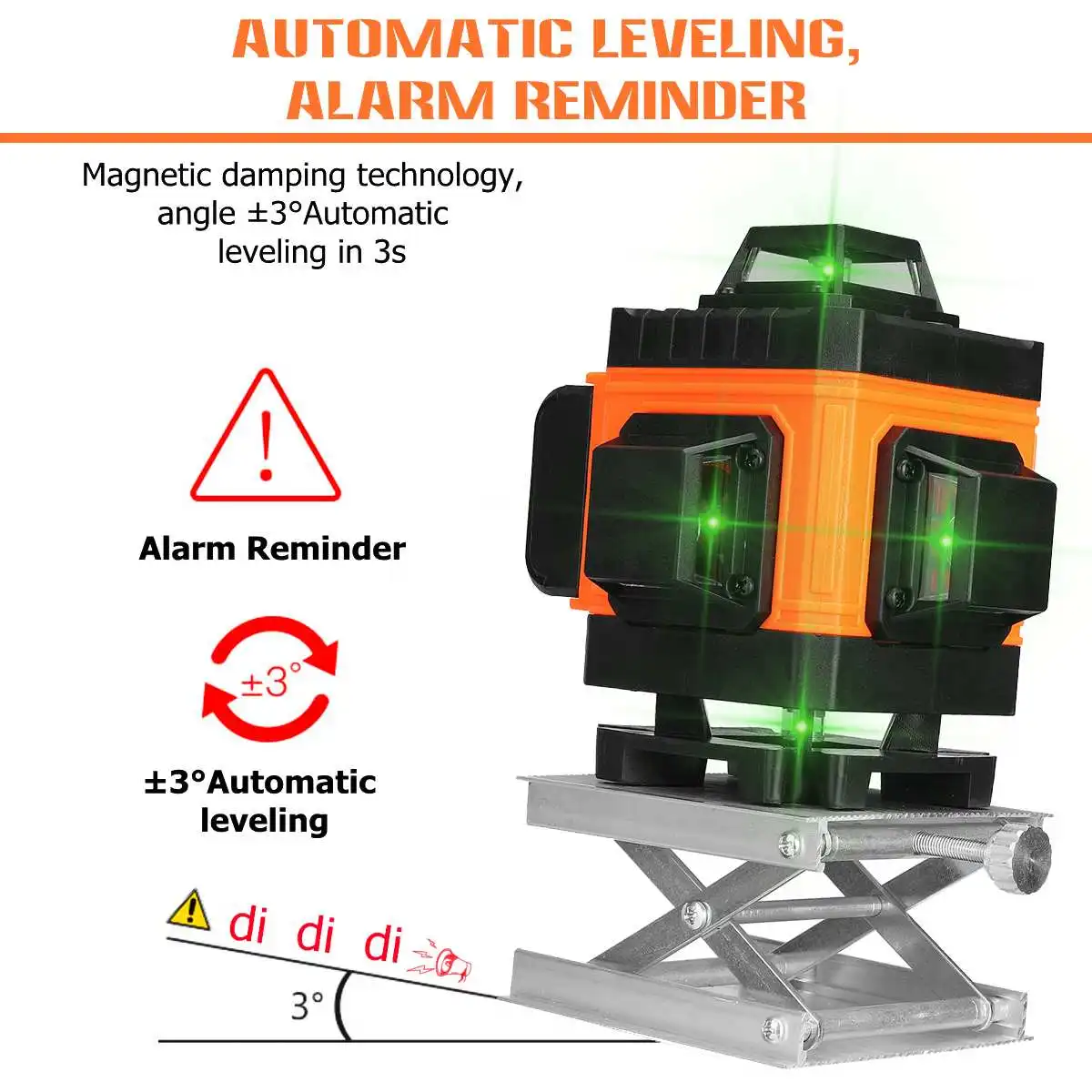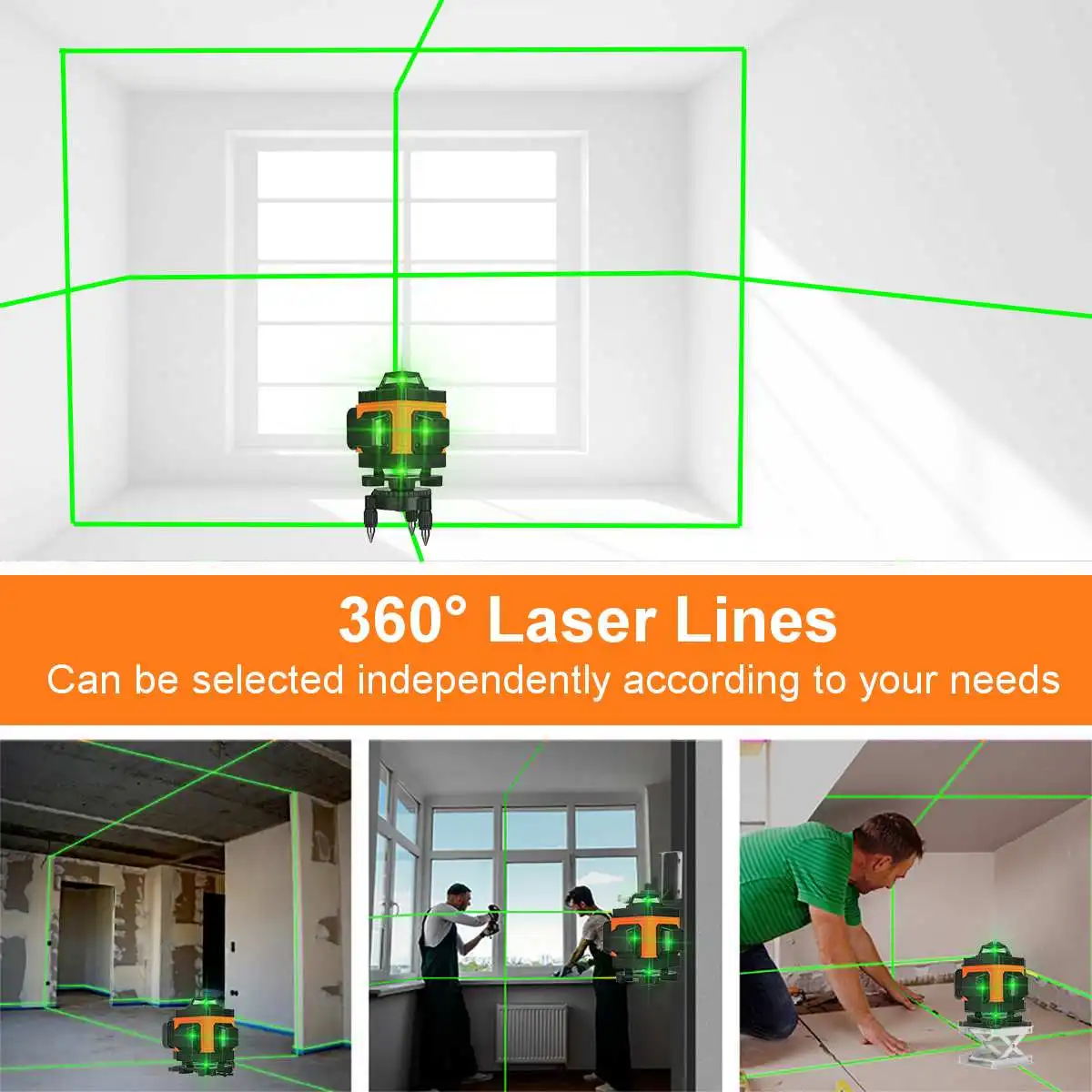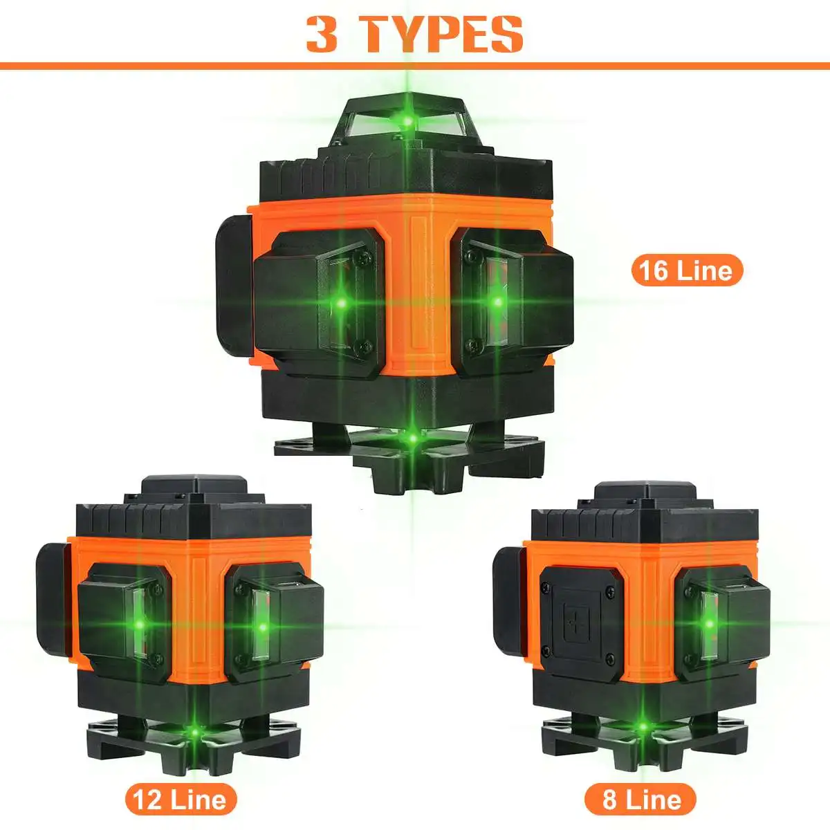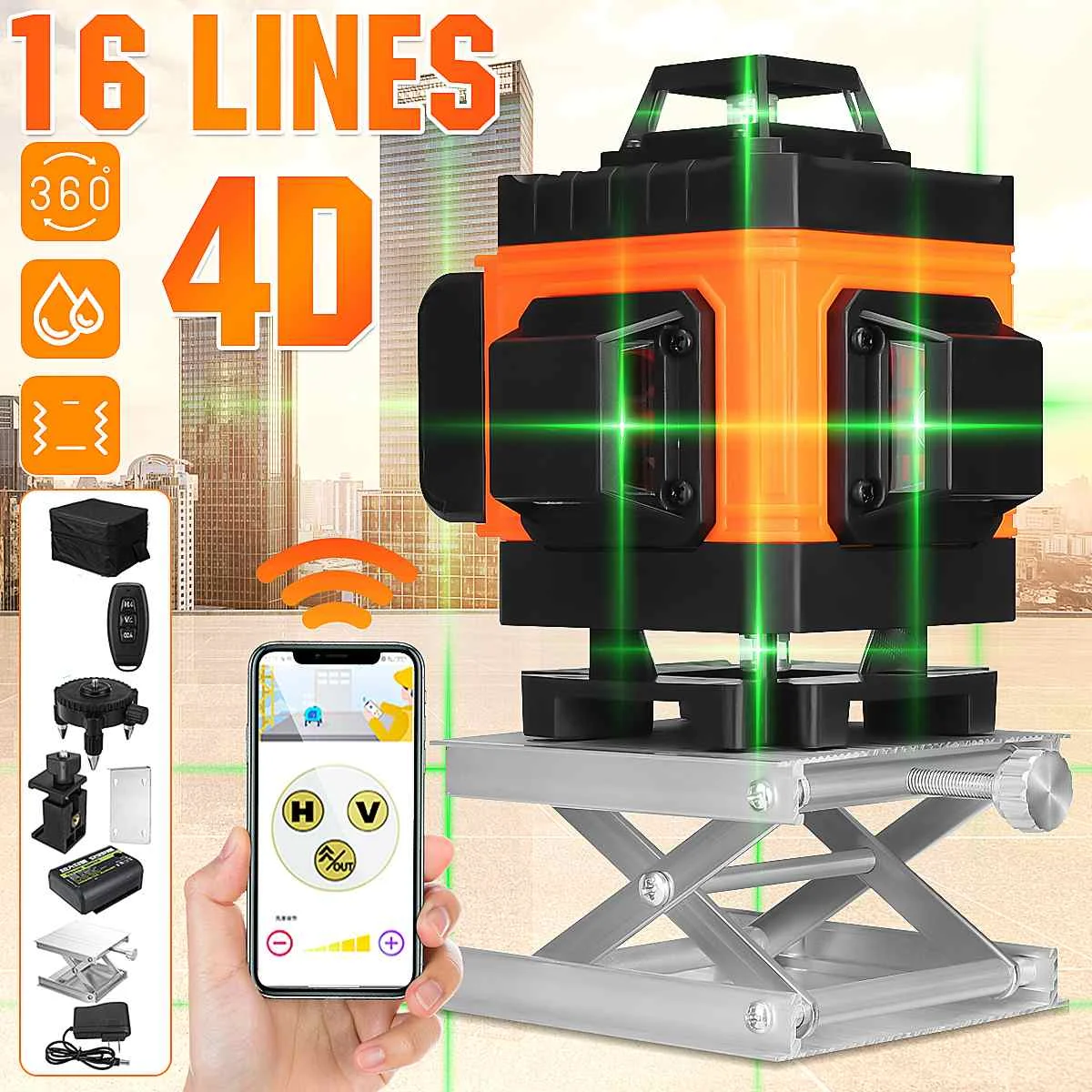 Лазерный уровень, 16 линий, 4D, 360 градусов, горизонтальный и вертикальный крест, супермощный самонивелирующийся лазерный уровень с зелеными линиями, управление через приложение