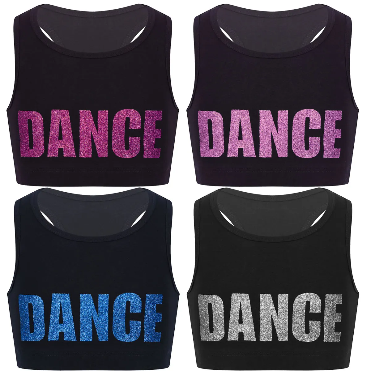 Детский укороченный топ для девочек, без рукавов, с блестящими надписями, спортивный, гимнастический, балетный Топ, сценический костюм для выступлений