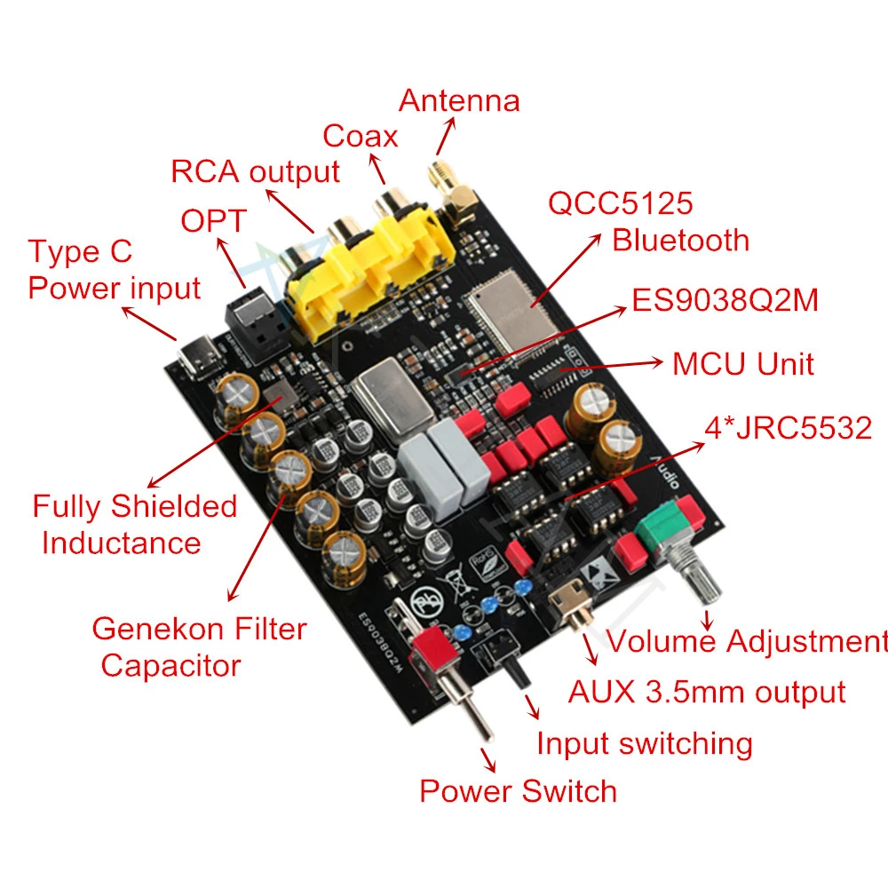Советы:▶Этот ЦАП использует блок питания 5 в постоянного тока, если напряжение слишком высокое, Он сожжет печатную плату.▶Рекомендуется использовать высококачественный адаптер питания, предпочтительно Линейный источник питания. Конечно, большинство мобильный телефон быстрой зарядкой, также доступны, но не все они поддерживаются. Если не поддерживается, замените другие Адаптеры 5 В.▶Этот ЦАП прошел строгую проверку производительности и уровня шума перед отправкой с завода. Если во время использования есть шум, его можно решить, заменив высококачественный источник питания или проверьте, есть ли электромагнитные помехи, просто слегка измените положениеПримечание:▶Интерфейс USB C может использоваться в качестве источника питания, и в то же время может также подключаться к ПК в качестве звуковой карты, при использовании переключите вход на «BT» и отключите от Bluetooth.▶Пароль подключения QCC5125 0123, новая версия отменяет пароль, который будет легче подключить smart TV.▶В Операционный усилитель s может быть изменен в размерную сетку США самостоятельно. Каждый Операционный усилитель несет ответственность за RCA и 3,5 мм левые и правые, вы можете выбрать более подходящую Операционный усилитель в соответствии с ваш собственный потребности для усиления звука.▶Новая версия добавляет Omron релейную защиту, при запуске не появляется звук.▶Пожалуйста, не стесняйтесь связаться с нами, если у вас есть какие-либо вопросы, мы ответим вам как можно скорее.Характеристики:▶Чип DAC: ES9038Q2M▶Чип Op: 4 * JRC5532DD (можно заменить)▶Аудио вход: Bluetooth/USB C/коаксиальный/OPT▶Аудио Выход: RCA/AUX 3,5 мм▶Bluetooth: QCC5125, поддержка: SBC/AAC/APTX/APTX-LL/APTX-HD/LDAC(96 кГц)/APTX-Adaptive▶Сопротивление: 10-300 Ом▶Источник питания: порт USB C, 5 В▶Размер: 100*130*35 мм▶Цвет: черный/серебристыйОсобенности:▶С помощью чипа декодера ES9038Q2M качество звука улучшено, и новейший чип Bluetooth QCC5125, мобильный телефон также может обеспечить хорошее звучание.▶Печатная плата была тщательно напечатана и спроектирована, с 4 сменными двойными операционными усилителями, Genicon фильтрующими аудиоконденсаторами, высокоточными активными кристаллическими осцилляторами, WIMA аудио конденсаторами и другими профессиональными частями, В том же классе редкие.▶Матовый корпус из алюминиевого сплава нежный и гладкий, с достаточным весом и отличным прикосновением!Посылка:▶1 * ЦАП ES9038Q2M▶1 * Bluetooth Антенна▶1 * USB C кабель