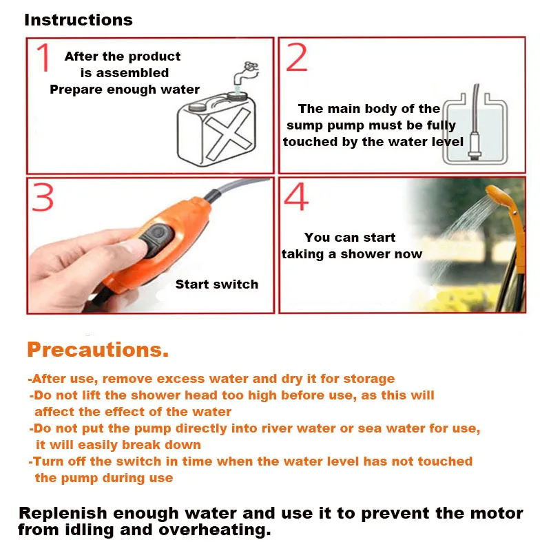 Электрический насос с переключателем ВКЛ/ВЫКЛ. Мощный поток воды с регулируемой ручкой давления. Компактный и портативный, легко носить с собой, простой в использовании. Для использования с автомобильным гнездом 12 В или любым портативным источником питания 12 В. Поставляется с присоской или крючком для подвешивания, кронштейном для душевой головки и удобной водонепроницаемой сумкой для хранения. Подходит для самостоятельного вождения душа для кемпинга, временного купания после купания, мытья автомобиля, полива цветов и т. д.