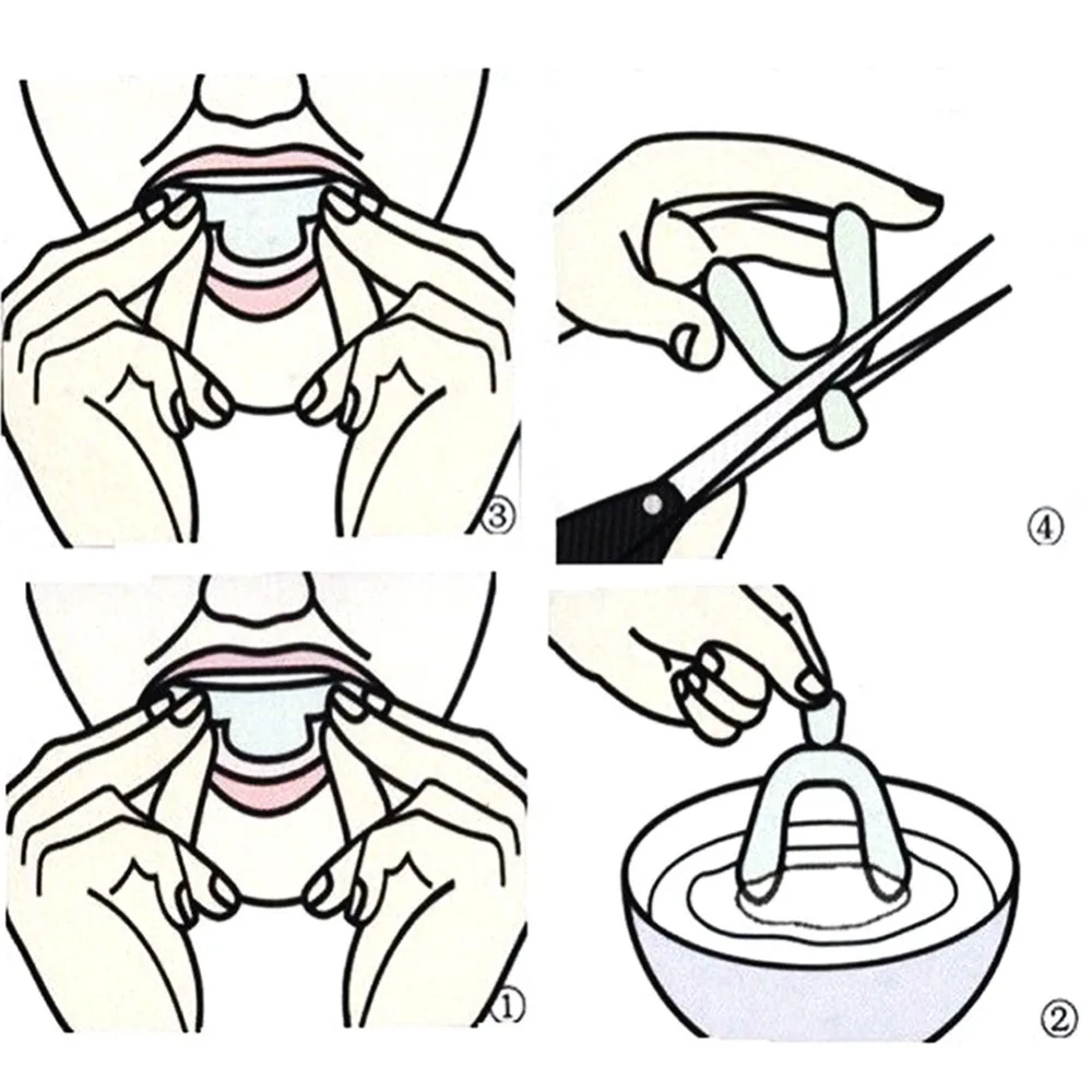 3. Сделайте мундштук: мундштук аккуратно и быстро Наденьте на зубную резинку, сосание закон продолжает делать шаг 1. Прижимная поверхность зубного протеза, делает его тоньше, в то время как верхняя тугая внутренняя поверхность зубного протеза и языка. (Быстрее, будьте осторожны, чтобы не кусать сильно. Мундштук немного горячий, но это не принесет никакого вреда)