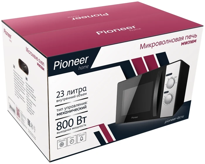 Надежная, стильная, современная и высококачественная микроволновая печь с глазами пионерской марки с дополнительной защитой от электромагнитного излучения благодаря усиленной передней дверной раме из высокопрочного стекла.Внутренняя камера с увеличенным объемом до 23 литров, несомненно, станет незаменимым помощником в большой семье или дружелюбном офисе, и, возможно, она станет верным другом, который подходит. Размораживание и нагревание пищи, не занимает много места на кухне, в доме или в офисе.Эта модель оснащена интуитивно понятным механическим управлением.Микроволновая печь изготовлена из металла, внутреннее покрытие камеры изготовлено из термостойкой эмали.Вращение пищи во время работы духовки способствует его равномерному приготовлению. Диаметр поворотного стола 27 см, внутри есть подсветка, дверь открывается удобной и безопасной эргономичной ручкой.Модель обеспечивает:-5 уровней мощности 100%-для быстрой и тщательной тренировки, а также нагрева, 80%-регулярные тренировки, 50%-медленная готовка, тушение, 30%-подготовка напитков и супов, 10%-обслуживание, смягчение мороженного медленное смягчение, максимальная мощность микроволновой печи 800 ВтАвтоматический размораж-Закончите звуковой сигнал.Время таймера позволяет установить время приготовления до 35 минут с точностью до одной минуты. Во время подготовки регулятор поворачивается против часовой стрелки. Когда он достигнет позиции 0, звуковой сигнал будет звучать, и процесс приготовления будет завершен.Длина шнура 0,85 м.Упаковочный листМикроволновая печь, роликовая стойка, стеклянный лоток, гарантийный талон, Инструкция на русском языке.