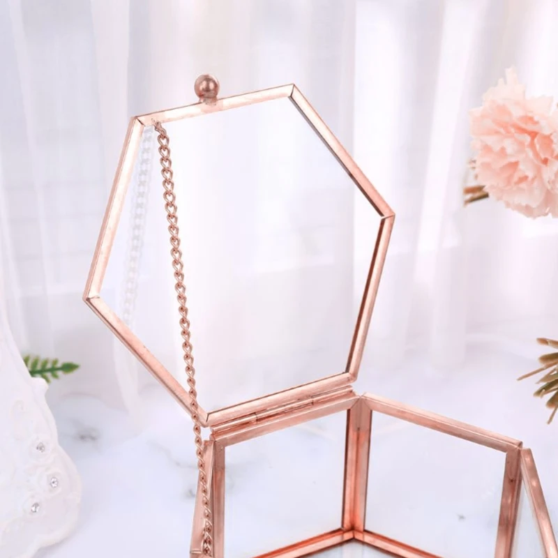 Шестиугольная прозрачная шкатулка для кольца из розового золота, коробка для обручального кольца, Геометрическая прозрачная стеклянная шкатулка для украшений, органайзер, настольный держатель