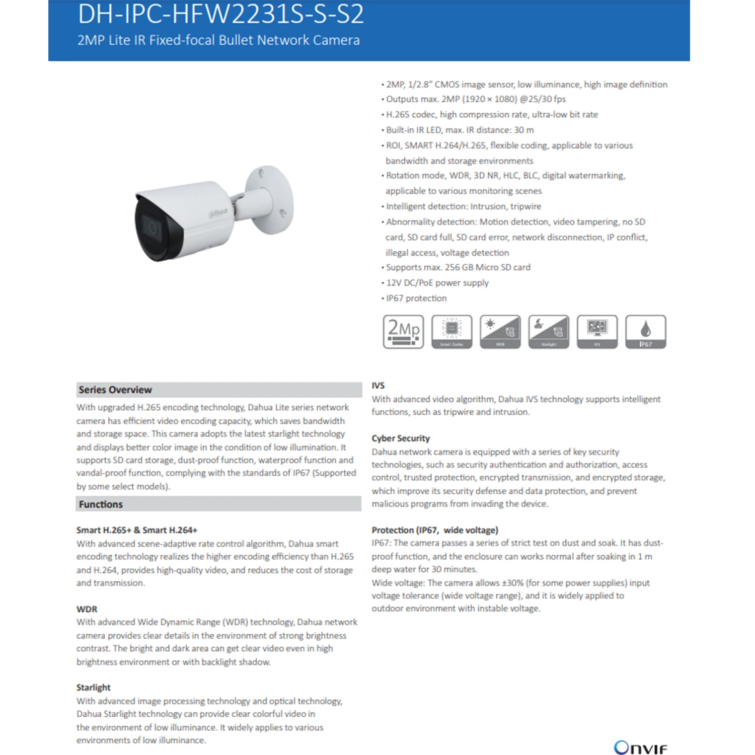 Камера видеонаблюдения Dahua, 2 МП, POE, Starlight, фонарь, H.265, IR30M, карта Micro SD на 256 ГБ, 12.8, CMOS, датчик изображения, веб-камера