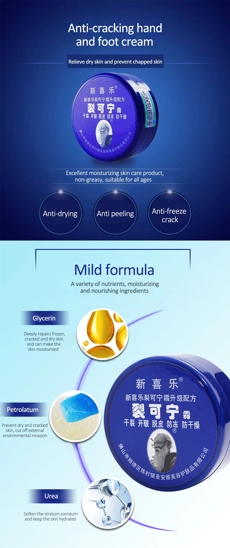 Вес нетто: 33 г/55 г/85 г на выборЦвет: синийФункция: предотвращает сухость и трещиныСрок годности: 3 годаПроисхождение: Сделано в Китае
