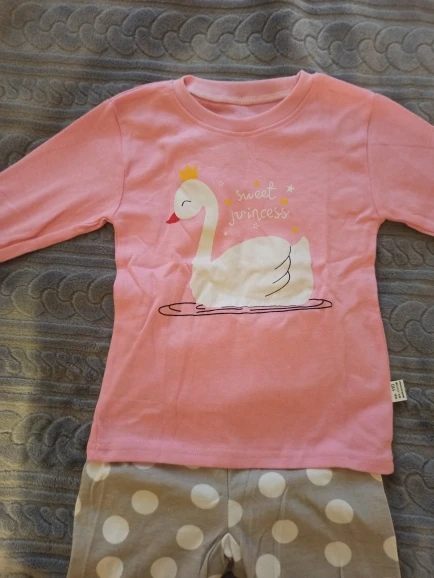 Пижама превзошла все мои ожидания. Качество отличное, плотный мягкий трикотаж с красивым принтом. На футболке с внешней стороны есть этикетка, там вся информация - состав, условия стирки и t° глажки, размер. На рост 100 см, следуя таблице продавца, я заказала размер 4T, что идёт на рост 110 см. Пижама подошла отлично. Пижама очень приятная и комфортная. У нас дома круглый год тепло, поэтому такая пижама будет идеальным вариантом, можно не переживать, если малыш раскроется. Принт очень красивый и чёткий. Брючки на резинке, она не тугая. Снизу на манжетах, что очень удобно. Все швы идеально ровные. И посмотрите какого она шикарного цвета. Розовая футболка и белые штанишки, на которых рисунок принта повторяется. Эта милая пижама понравится любой, даже самой привередливой маме и сделает ребёнка счастливым.