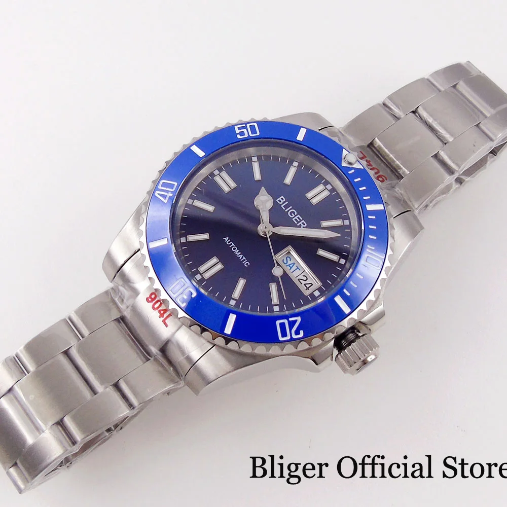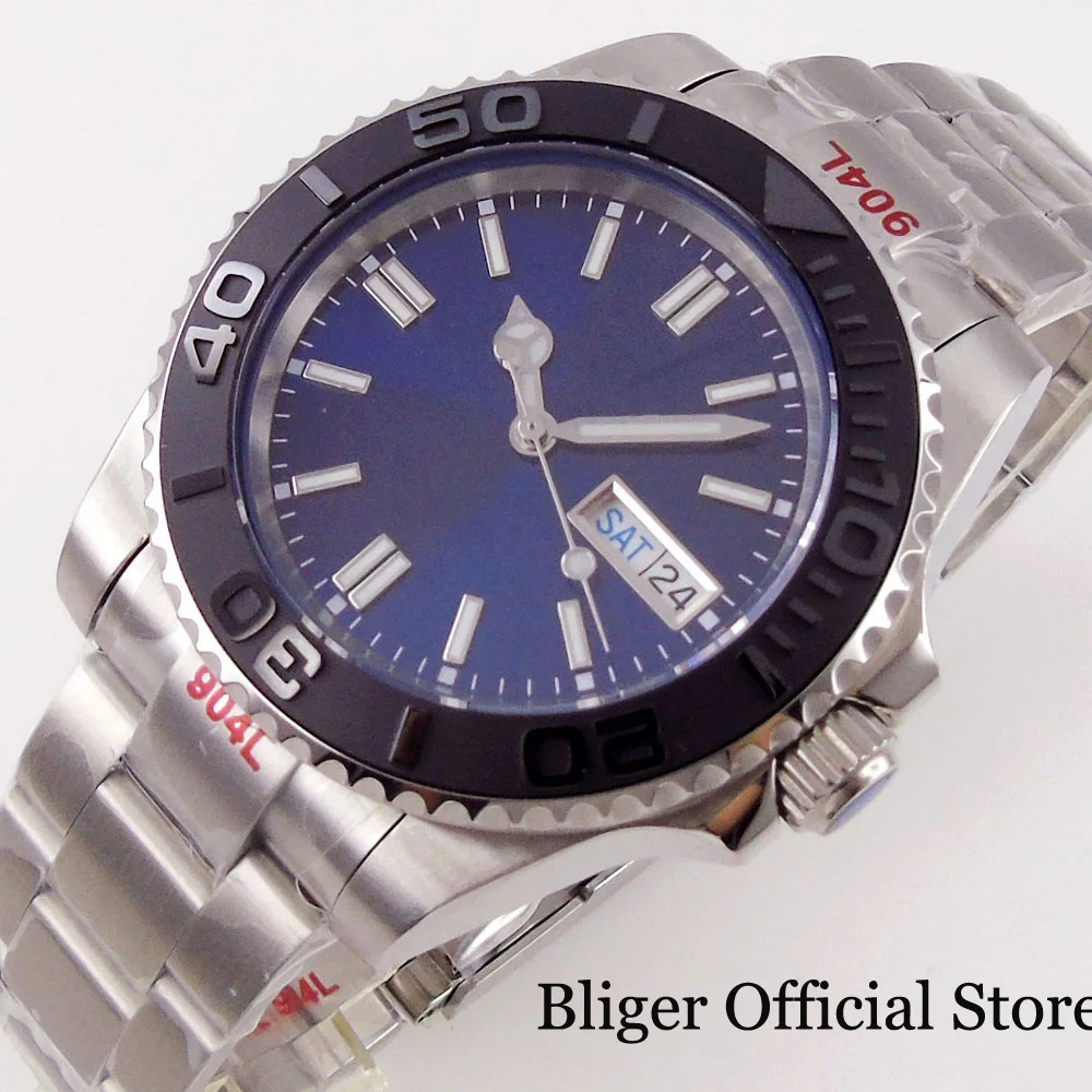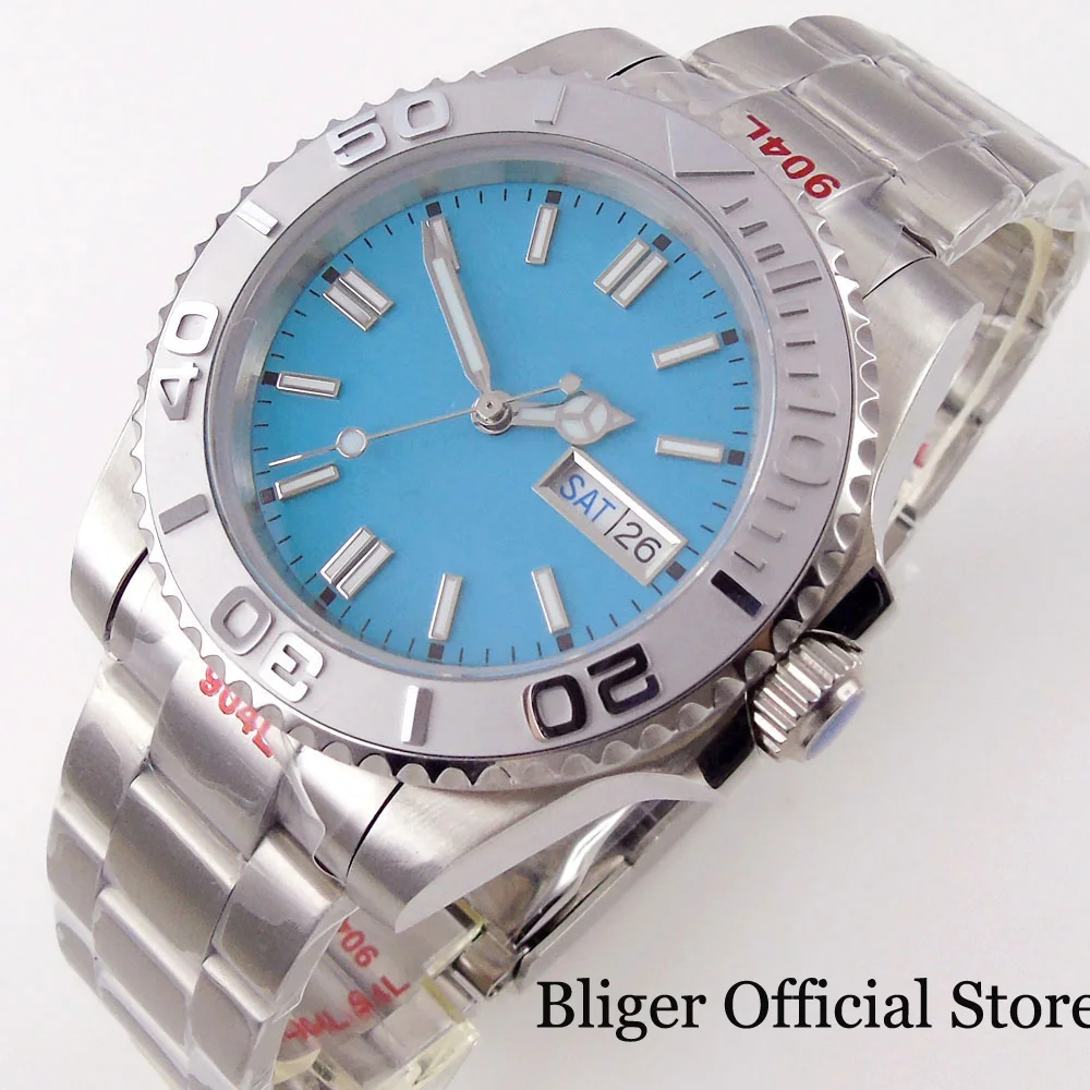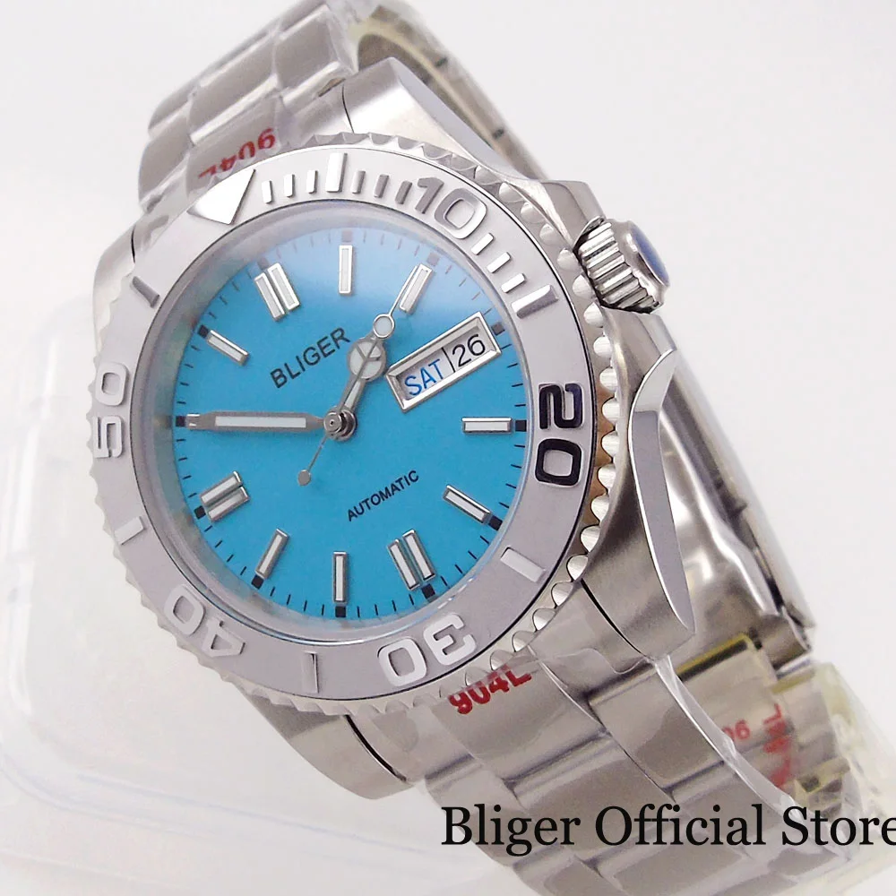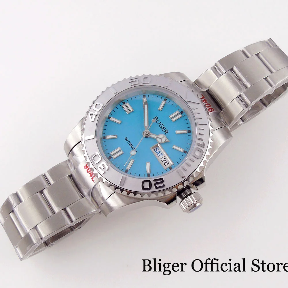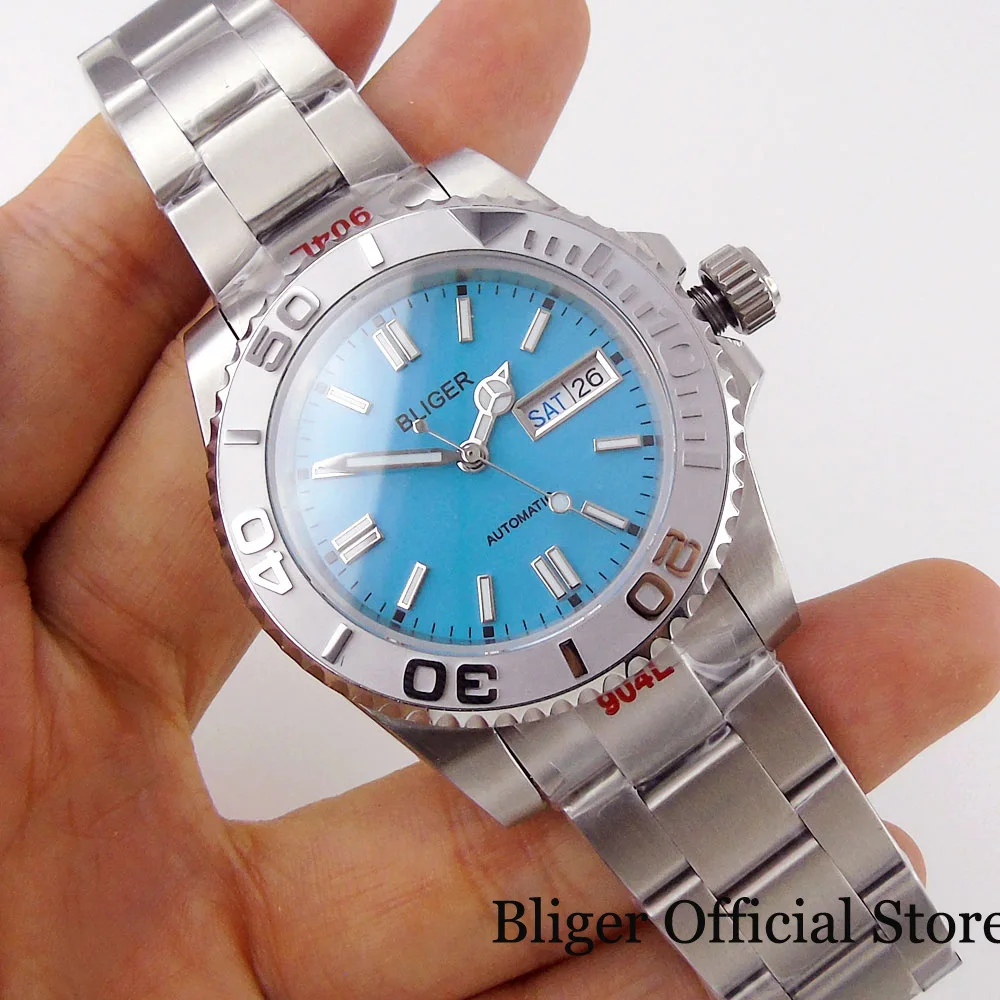 Новинка, мужские наручные часы BLIGER небесно-голубого цвета NH36A Move, мужские наручные часы с автоподзаводом, матовая серая вставка, устричная скользящая застежка, окно на выходные дни