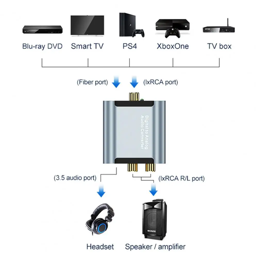Стерео аудио коаксиальный Toslink цифро-аналоговый преобразователь усилитель декодер адаптер для ТВ Описание:С дизайном plug and play, легко устанавливается и работает.Он преобразует коаксиальные или Toslink цифровые аудио сигналы в аналоговый L/R аудио. И обеспечивает электромагнитную передачу без шума.Он изготовлен из алюминиевого сплава с позолоченным интерфейсом, который устойчив к коррозии, не ржавеет и прочен.Длина нерасширенного изделия 15 см, ширина 11 см, высота 4 см. Длина расширенного изделия-25,6 мм, ширина-68 мм, высота-24,6 мм.Он имеет 24-бит S/PDIF входящий бит потока на левые и правые каналы. Он предназначен для домашнего или профессионального переключения звука. Наименование товара: аудио декодерМатериал: алюминиевый сплавИсточник питания: DC5VЧастота дискретизации: 48-96 кГцВыход: 1xrca оборот в минуту (R/L лотосы), 3,5 мм аудио Порты и разъёмыВход: Toslink/1xRCA (коаксиальный)Информация о размере:Нераспространенный Размеры: 15 см x 11 см x 4 см/5,91 "x 4,33" x 1,57 "(прибл.)Расширенный размер: 25,6 мм x 68 мм x 24,6 мм/1,01 "x 2,68" x 0,97 "(прибл.) Примечания:Благодаря светильник и экрана Цвет Товара может быть s светильник ly отличается из-за характеристик монитора компьютера.Возможны незначительные отклонения в размерах из-за различных измерений вручную. Посылка включает в себя:Стиль A:1 x аудио декодер1 x Кабель Toslink1 х USB кабельИлиСтиль B:1 x аудио декодер1 x коаксиальный кабель1 х USB кабельИлиСтиль C:1 x аудио декодер1 х адаптер американского стандартаИлиСтиль D:1 x аудио декодер1 х адаптер европейского стандарта