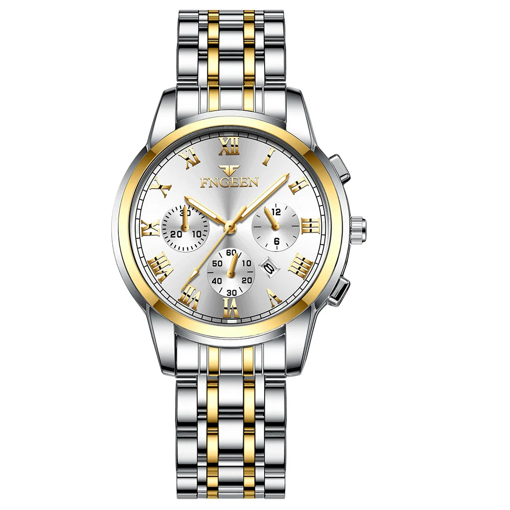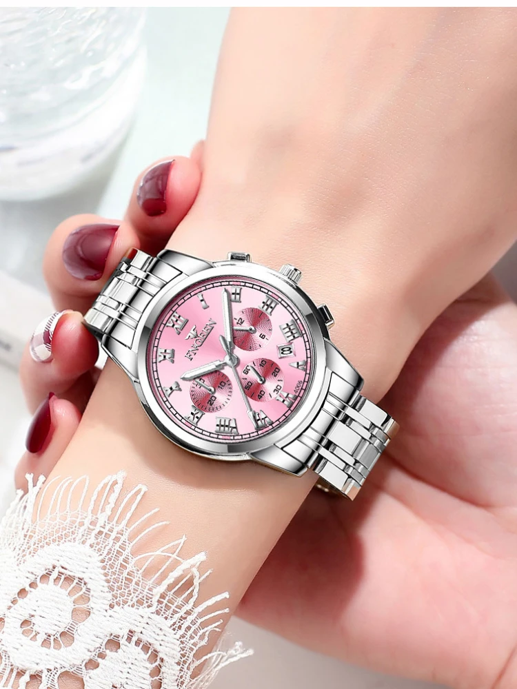 Женские часы FNGEENS, водонепроницаемые, с тремя глазами, с шестиконтактным ремешком из нержавеющей стали, светящиеся