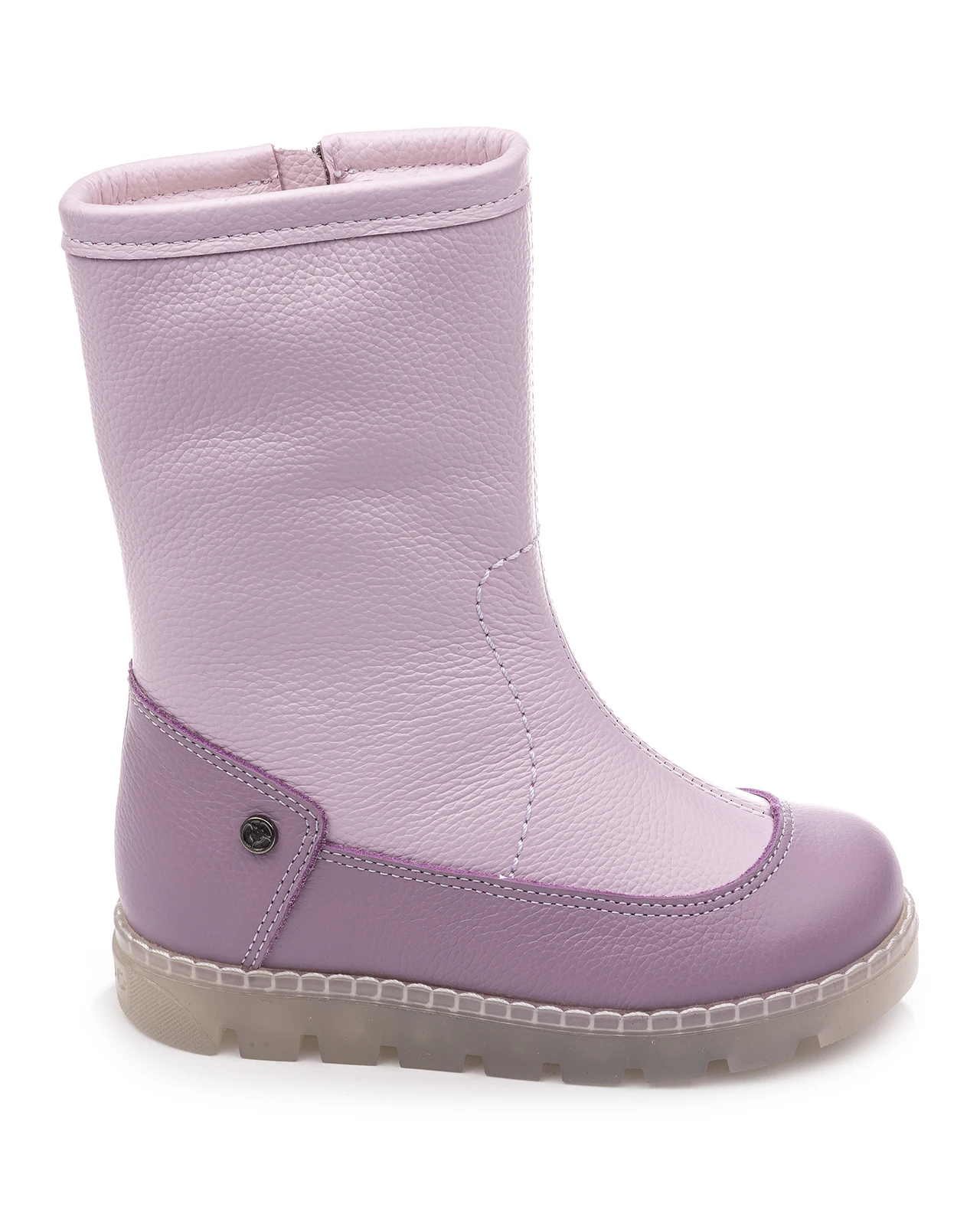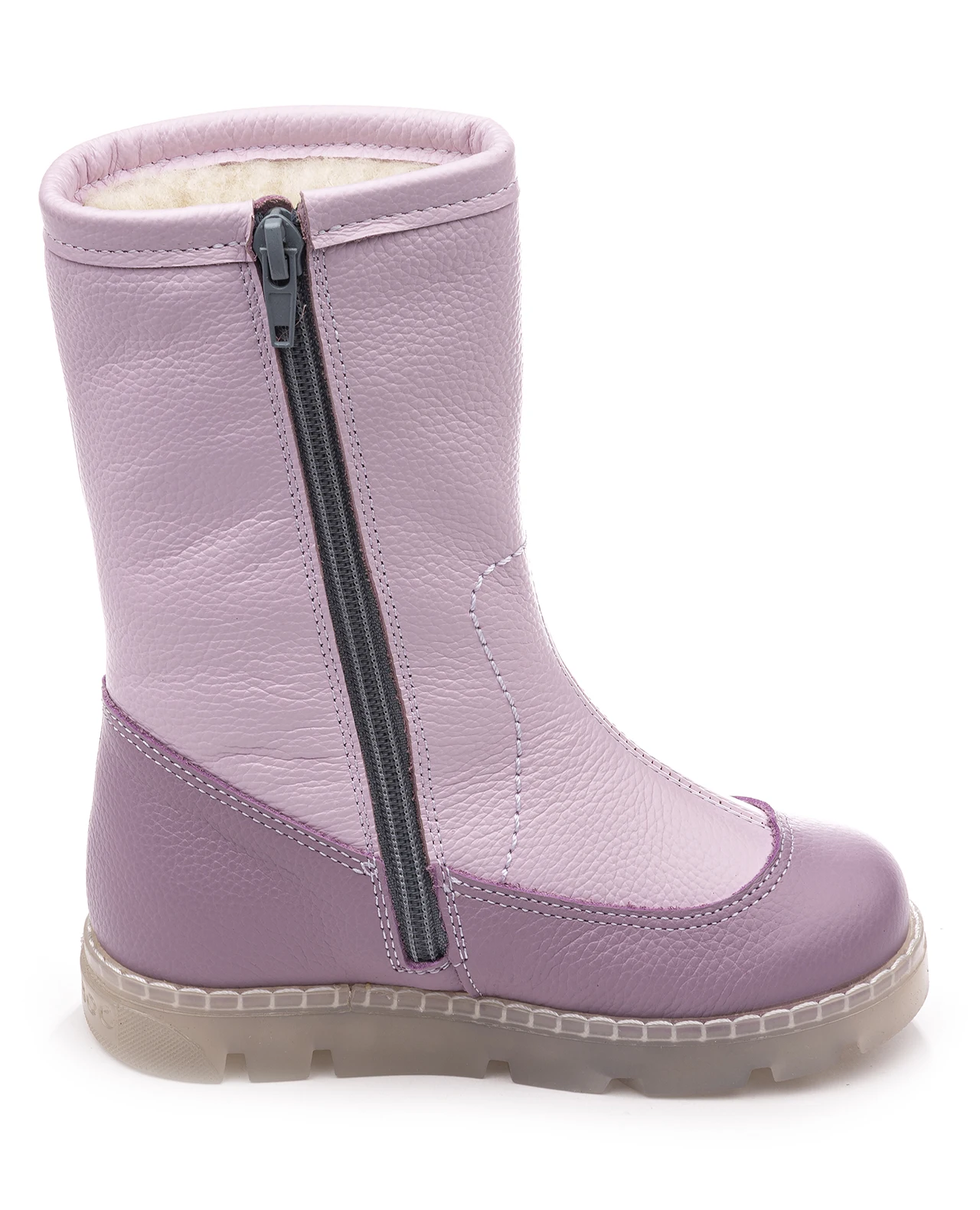 Нежные утепленные сапожки для девочки на подкладке из шерстяного меха. Выполнены из натуральной кожи сиреневого цвета с контрастным носом. Многослойная, анатомическая стелька для правильного формирования стопы. Жесткий фиксирующий задник с удлиненным крылом надежно стабилизирует голеностопный сустав во время ходьбы. Упругая, умеренно-эластичная подошва с протектором, имеющая перекат, позволяющий повторить естественное движение стопы при ходьбе для правильного распределения нагрузки на опорно-двигательный аппарат ребенка. Подкладка из шерстяного меха поддерживает комфортную температуру внутри обуви при погодных условиях от - 5 до -15 градусов. Застежка-молния позволяет легко надевать обувь. Сапожки украшены контрастной строчкой и фирменным логотипом.