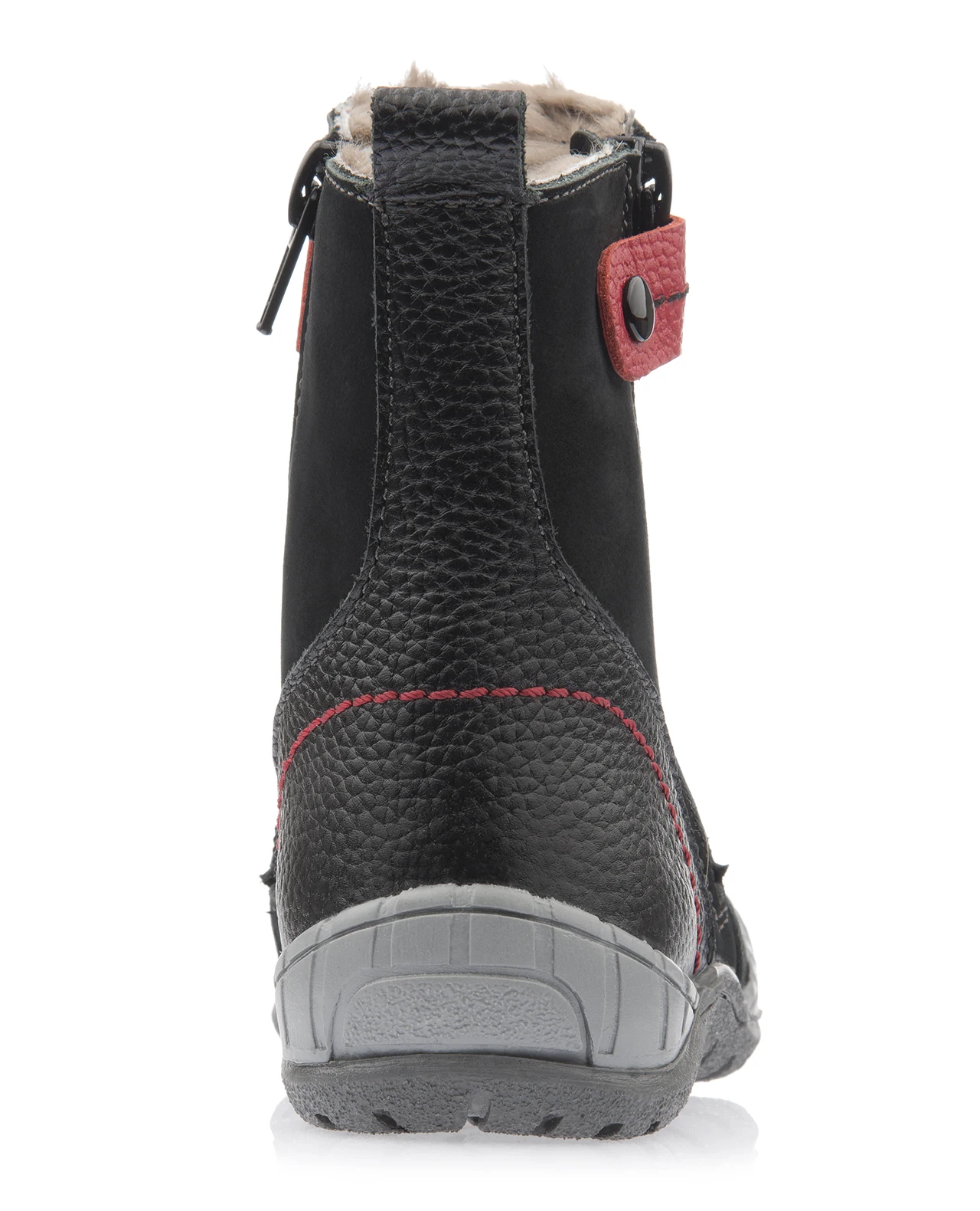 Сапожки утепленные, на подкладке из натурального меха, для самых маленьких. Выполнены из натурального нубука чёрного цвета, носок и пятка - из натуральной гладкой кожи в тон. Ярко-красный ремешок по верху изделия придает модели модный, контрастный акцент. Застежки-молния с двух сторон обеспечивают максимальное раскрытие и комфорт при надевании. Многослойная, анатомическая стелька для правильного формирования стопы. Упругая, умеренно-эластичная подошва, имеющая перекат, позволяющий повторить естественное движение стопы при ходьбе для правильного распределения нагрузки на опорно-двигательный аппарат ребенка. Подошва закрывает часть носка и пятки, что дополнительно защищает модель от промокания в сырую погоду. Подкладка из натурального меха поддерживает комфортную температуру внутри обуви при погодных условиях от - 10 до -25 градусов. Сапожки украшены контрастной строчкой и милыми кнопочками по бокам.